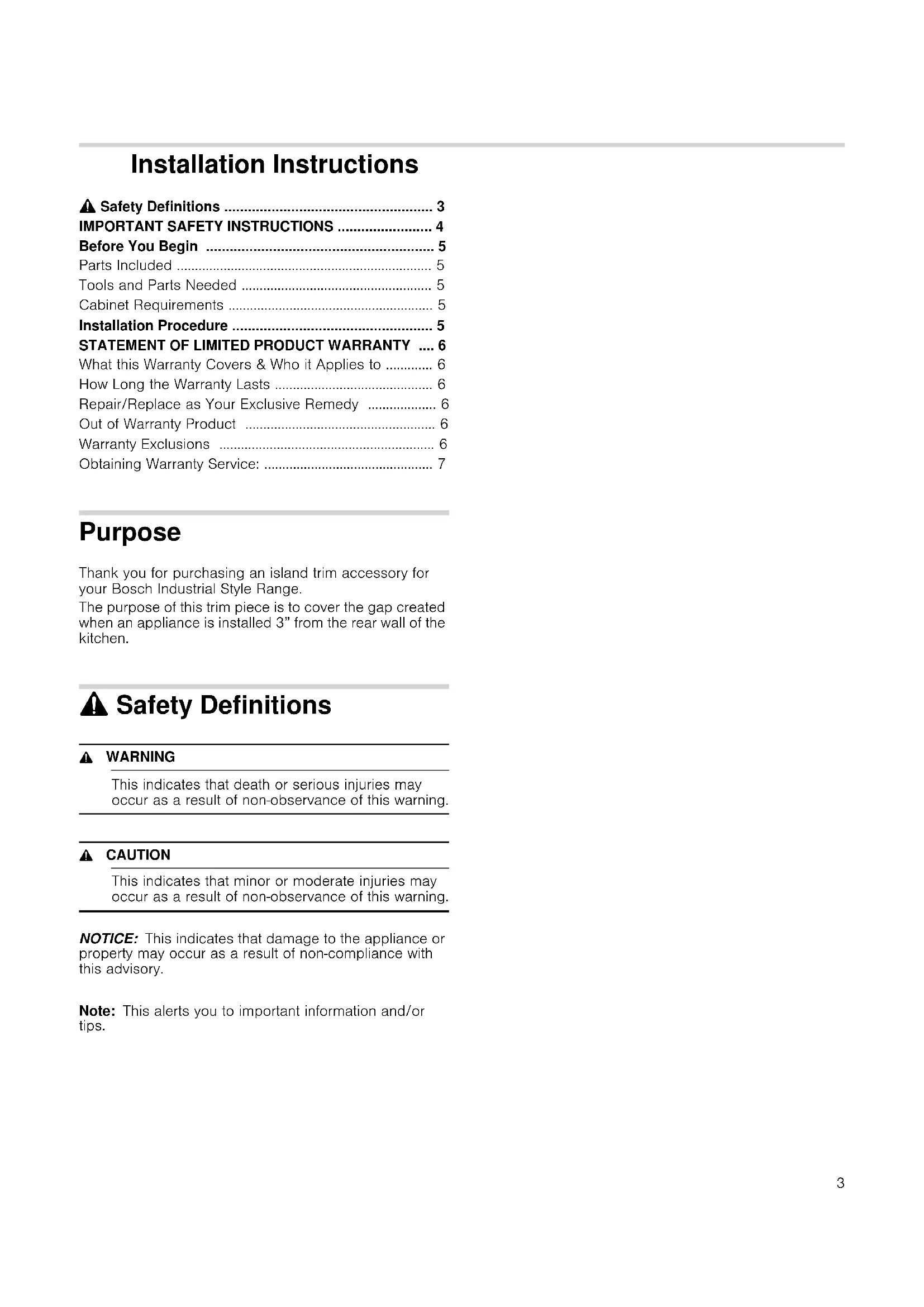 - Obtaining Warranty Service: Purpose Thank you for purchasing an island trim accessory for your Bosch Industrial Style Range. The purpose of this trim piece is to cover the gap created when an appliance is installed 3” from the rear wall of the kitchen. 9 Safety Definitions Safety Definitions 9 WARNING This indicates that death or serious injuries may occur as a result of non-observance of this warning. 9 CAUTION This indicates that minor or moderate injuries may occur as a result of non-observance of this warning. NOTICE: This indicates that damage to the appliance or property may occur as a result of non-compliance with this advisory. Note: This alerts you to important information and/or tips.9 IMPORTANT SAFETY INSTRUCTIONS p. 7
