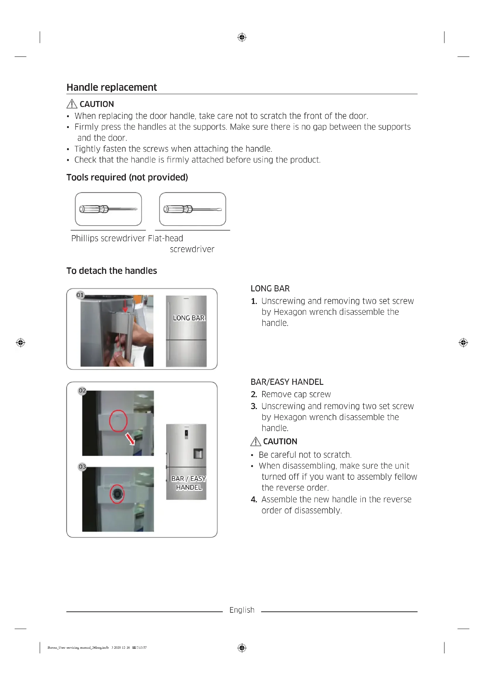 - Be sure to wear safety gloves while making repairs. Barosa_User-servicing-manual_26lang.indb 1 2020-12-16 7:15:56English The actual image and provided parts of the refrigerator may differ, depending on the model and the country.