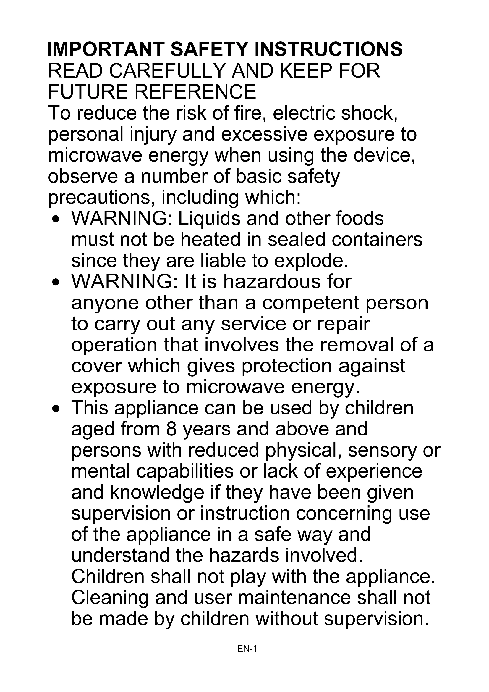 - WARNING: When the appliance is operated in the combination mode, children should only use the oven under adult supervision due to the temperatures generated.