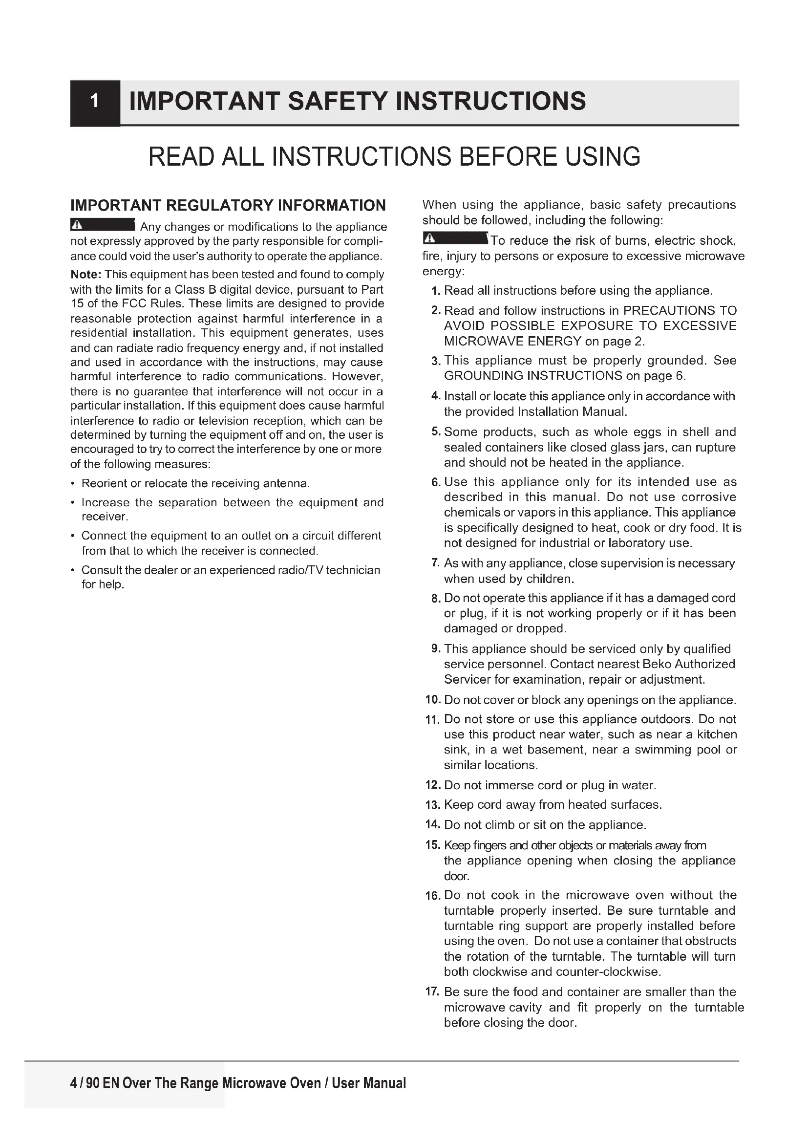 9 AUTO-TOUCH GUIDE ..........................................23 3 / 90 ENOver The Range Microwave Oven / User ManualIMPORTANT REGULATORY INFORMATION WARNINGWARNING Any changes or modications to the appliance not expressly approved by the party responsible for compli-ance could void the user’s authority to operate the appliance.Note: This equipment has been tested and found to comply with the limits for a Class B digital device, pursuant to Part 15 of the FCC Rules. These limits are designed to provide reasonable protection against harmful interference in a residential installation. This equipment generates, uses and can radiate radio frequency energy and, if not installed and used in accordance with the instructions, may cause harmful interference to radio communications. However, there is no guarantee that interference will not occur in a particular installation. If this equipment does cause harmful interference to radio or television reception, which can be determined by turning the equipment off and on, the user is encouraged to try to correct the interference by one or more of the following measures:• Reorient or relocate the receiving antenna.• Increase the separation between the equipment and receiver.• Connect the equipment to an outlet on a circuit different from that to which the receiver is connected.• Consult the dealer or an experienced radio/TV technician for help.