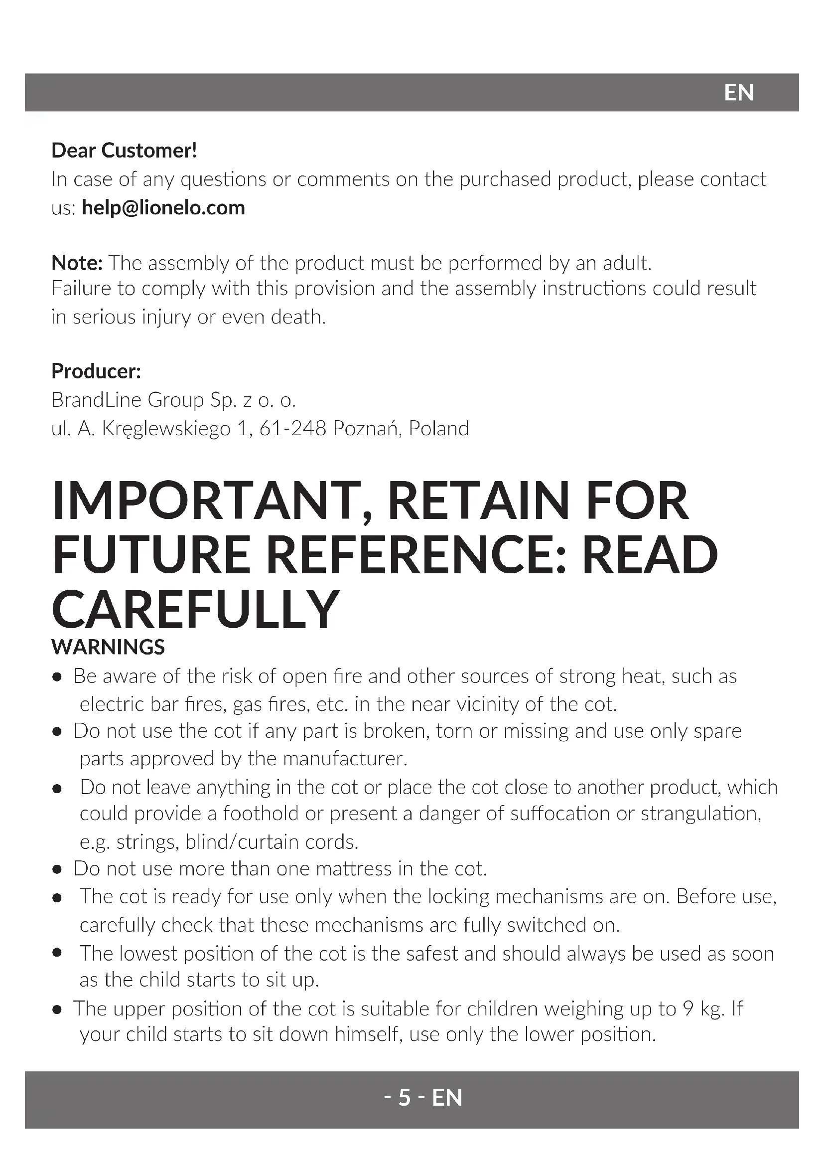 Dear Customer! In case of any quesons or comments on the purchased product, please contact us: help@lionelo.com Note: The assembly of the product must be performed by an adult. Failure to comply with this provision and the assembly instrucons could result in serious injury or even death. Producer: BrandLine Group Sp. z o. o. ul. A. Kręglewskiego 1, 61-248 Poznań, Poland