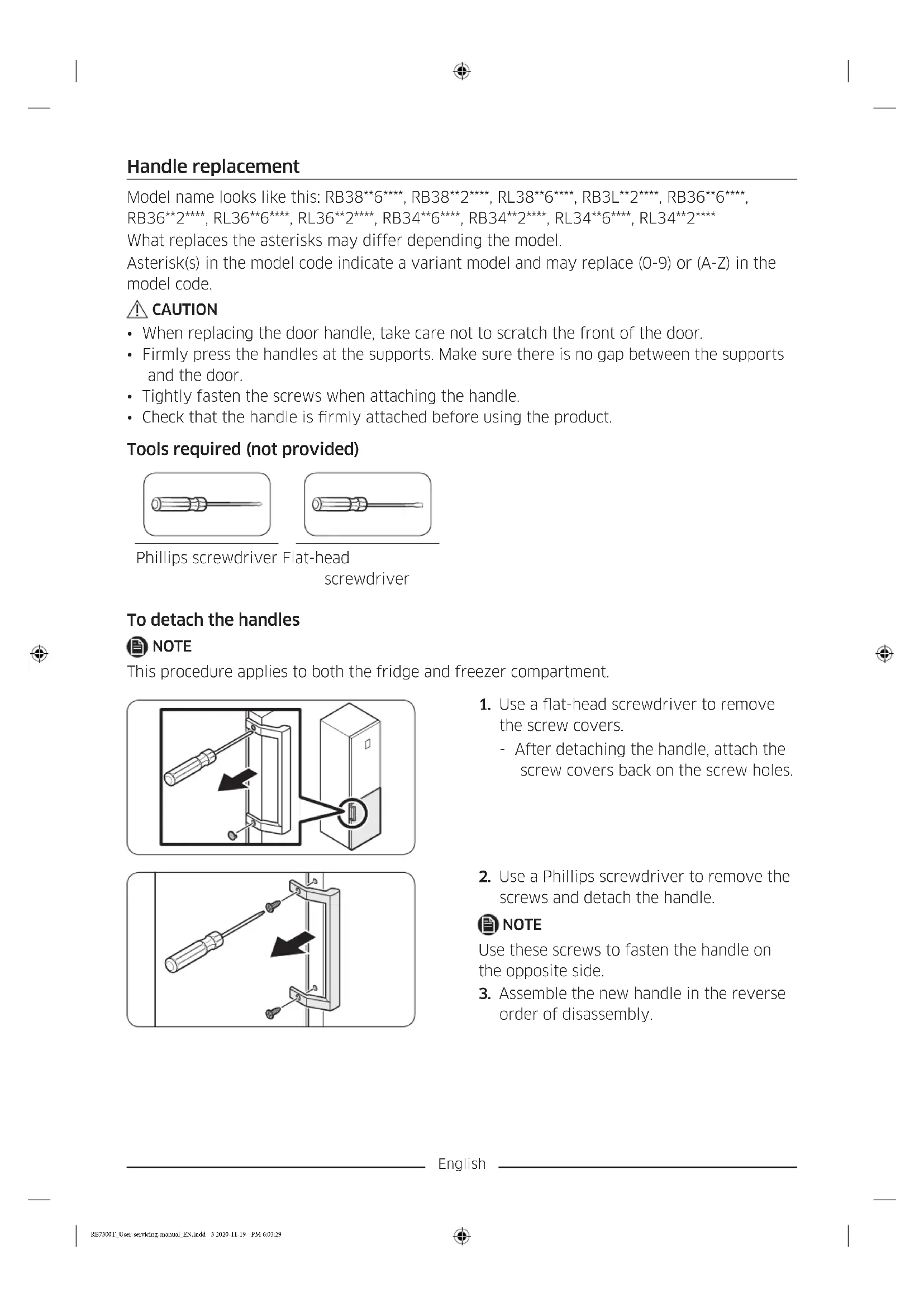 - Disconnect the power cord before reversing the doors. Tools required (not provided) Phillips screwdriver Flat-head screwdriver 11 mm spanner 10 mm socket wrench 8 mm socket wrench 10 mm spanner RB7300T_User-servicing-manual_EN.indd 5 2020-11-19 PM 6:03:31English Reversing the door NOTE For the models with handles, reverse the handles rst. (For detailed information, see the “Handle replacement (For models with bar handles)” section.)
