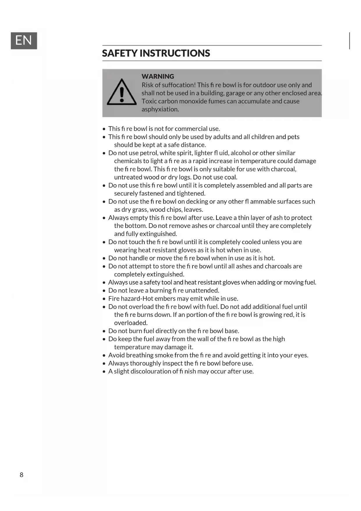 SAFETY INSTRUCTIONS WARNING Risk of suffocation! This re bowl is for outdoor use only and shall not be used in a building, garage or any other enclosed area. Toxic carbon monoxide fumes can accumulate and cause asphyxiation.