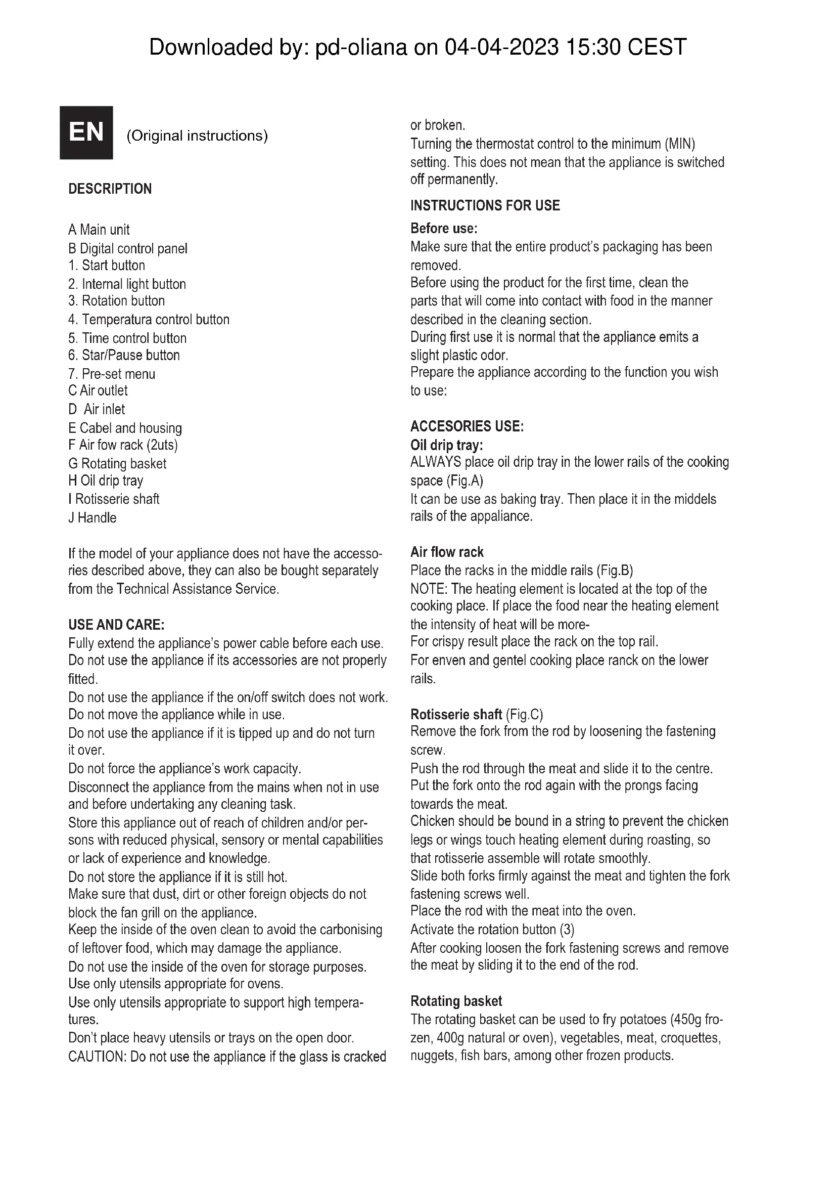 Before use: Make sure that the entire product’s packaging has been removed. Before using the product for the rst time, clean the parts that will come into contact with food in the manner described in the cleaning section. During rst use it is normal that the appliance emits a slight plastic odor. Prepare the appliance according to the function you wish to use: ACCESORIES USE: Oil drip tray: ALWAYS place oil drip tray in the lower rails of the cooking space (Fig.A) It can be use as baking tray. Then place it in the middels rails of the appaliance. Air ow rack Place the racks in the middle rails (Fig.B) NOTE: The heating element is located at the top of the cooking place. If place the food near the heating element the intensity of heat will be more- For crispy result place the rack on the top rail. For enven and gentel cooking place ranck on the lower rails. Rotisserie shaft (Fig.C) Remove the fork from the rod by loosening the fastening screw. Push the rod through the meat and slide it to the centre. Put the fork onto the rod again with the prongs facing towards the meat. Chicken should be bound in a string to prevent the chicken legs or wings touch heating element during roasting, so that rotisserie assemble will rotate smoothly. Slide both forks rmly against the meat and tighten the fork fastening screws well. Place the rod with the meat into the oven. Activate the rotation button (3) After cooking loosen the fork fastening screws and remove the meat by sliding it to the end of the rod. Rotating basket The rotating basket can be used to fry potatoes (450g fro- zen, 400g natural or oven), vegetables, meat, croquettes, nuggets, sh bars, among other frozen products. EN (Original instructions) Downloaded by: pd-oliana on 04-04-2023 15:30 CESTNOTE: For even cooking, DO NOT overll the basket. Make sure the basket is tightly closed before starting the cooking process. To place the basket in the appliance, rst insert the left side (Fig.D) and then hook the right side (Fig.E) into the bracket. Activate the rotation button (3) Use: Extend the cable completely before plugging it in. Connect the appliance to the mains. Open the door If you don’t use the oil tray pan (H) as baking tray place it at the bottom part of the appliance. Use the appropriate accessory according to the food you want to cook. Prepare the food, place it in the accessory and insert it into the appliance. Close the door Press the power button during few seconds. The screen will activate. Then select the temperature by pressing the temperature control button (4). Select the appropriate time by pressing the time control button (5) for cooking or select the pre-dened program (7) if you wish. NOTE: keep in mind that the cooking time may vary depending on the food, quantity and size. If you use rotisserie accessory or the rotating basket, you may select Rotation Button (3). By pressing the internal light button (2) you can check the cooking process while the appliance is operating. If you open the door, the appliance will pause automatical- ly and the light will come on. When you close it again, the applieance will start up again. After the selected time or once the pre-dened menu is nished, the appliance will stop automatically and emit a beep. To completely turn off the appliance press the power button until the screen turns off. Open the door and remove the food. CAUTION: Always use oven gloves to protect your hands. The metallic parts can become very hot during use. Take care when touching the rods and the forks. To minimize the generation of acrylamide during the food cooking process, do not allow food to turn dark tan or black. Let the appliance and tools cool down before cleaning. Rotisserie Function:
