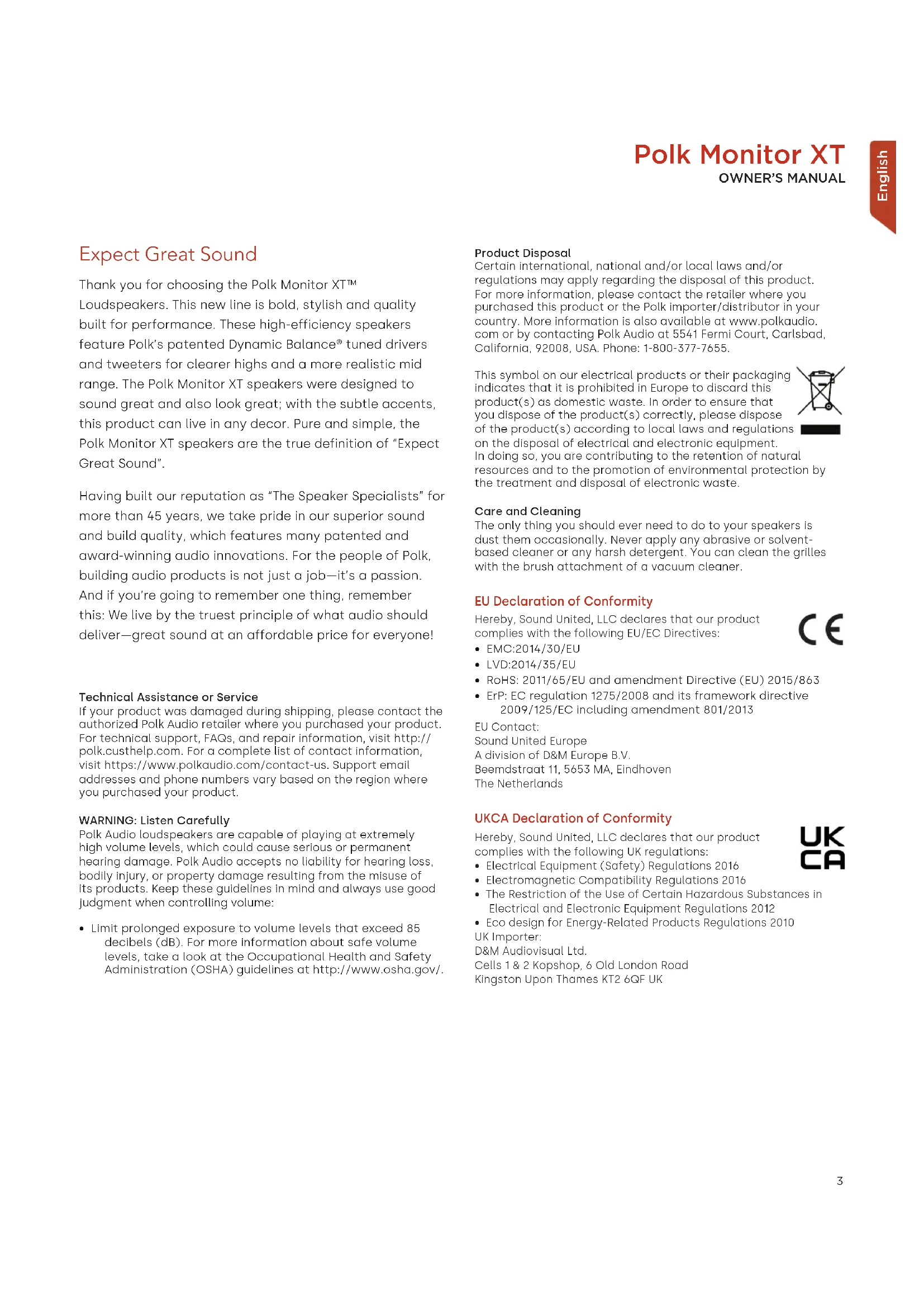 - Limit prolonged exposure to volume levels that exceed 85 decibels (dB). For more information about safe volume levels, take a look at the Occupational Health and Safety Administration (OSHA) guidelines at http://www.osha.gov/. Product Disposal Certain international, national and/or local laws and/or regulations may apply regarding the disposal of this product. For more information, please contact the retailer where you purchased this product or the Polk importer/distributor in your country. More information is also available at www.polkaudio. com or by contacting Polk Audio at 5541 Fermi Court, Carlsbad, California, 92008, USA. Phone: 1-800-377-7655. This symbol on our electrical products or their packaging indicates that it is prohibited in Europe to discard this product(s) as domestic waste. In order to ensure that you dispose of the product(s) correctly, please dispose of the product(s) according to local laws and regulations on the disposal of electrical and electronic equipment. In doing so, you are contributing to the retention of natural resources and to the promotion of environmental protection by the treatment and disposal of electronic waste. Care and Cleaning The only thing you should ever need to do to your speakers is dust them occasionally. Never apply any abrasive or solvent- based cleaner or any harsh detergent. You can clean the grilles with the brush attachment of a vacuum cleaner. EU Declaration of Conformity Hereby, Sound United, LLC declares that our product complies with the following EU/EC Directives: