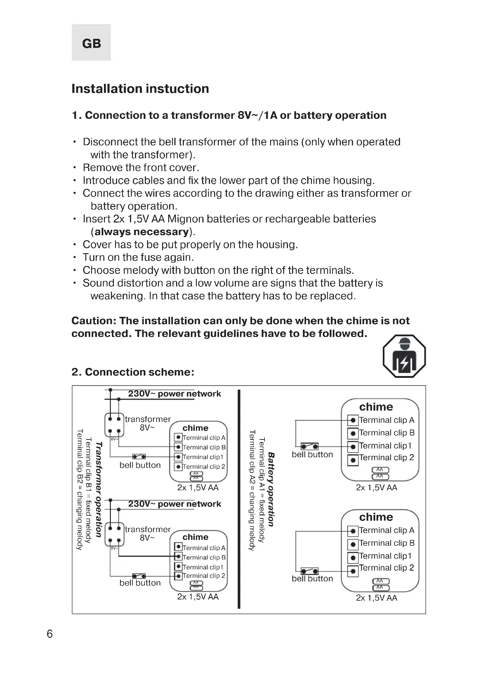 Caution: The installation can only be done when the chime is not connected. The relevant guidelines have to be followed.