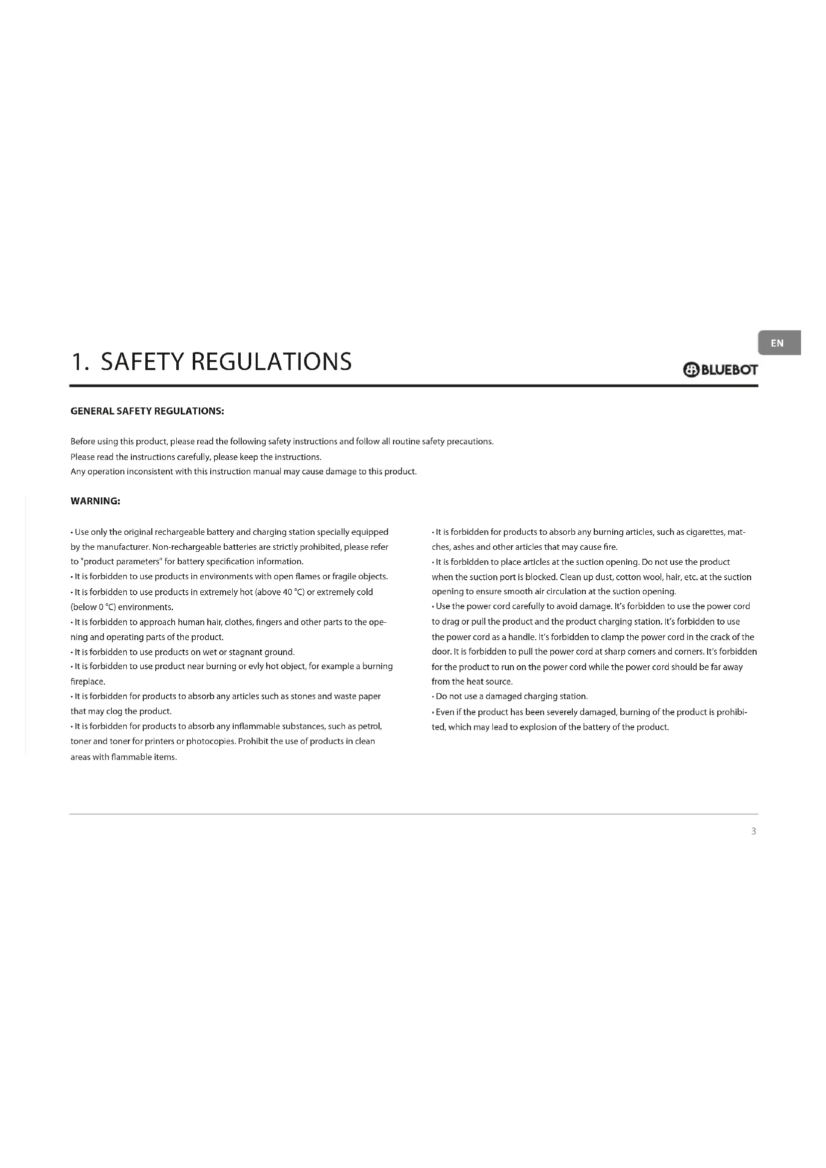 - Use the power cord carefully to avoid damage. It’s forbidden to use the power cord to drag or pull the product and the product charging station. It’s forbidden to use the power cord as a handle. It’s forbidden to clamp the power cord in the crack of the door. It is forbidden to pull the power cord at sharp corners and corners. It’s forbidden for the product to run on the power cord while the power cord should be far away from the heat source.