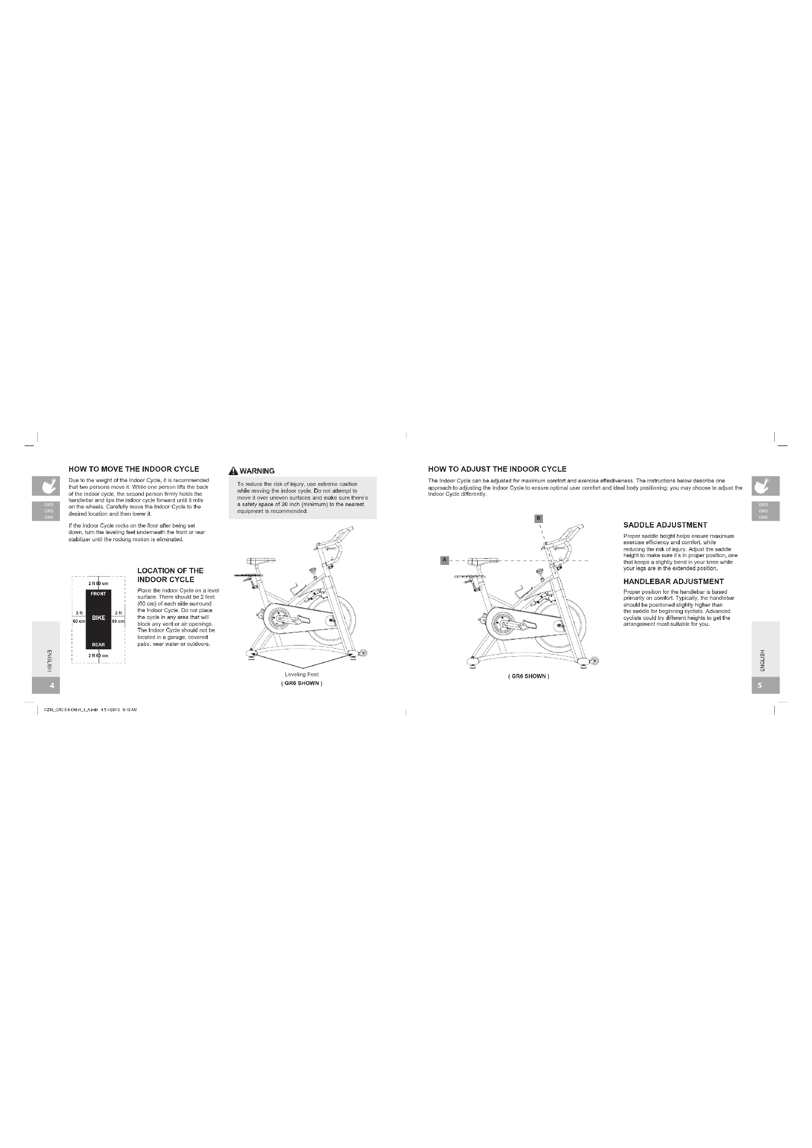 Due to the weight of the Indoor Cycle, it is recommended that two persons move it. While one person lifts the back of the indoor cycle, the second person firmly holds the handlebar and tips the indoor cycle forward until it rolls on the wheels. Carefully move the Indoor Cycle to the desired location and then lower it. If the Indoor Cycle rocks on the floor after being set down, turn the leveling feet underneath the front or rear stabilizer until the rocking motion is eliminated. Leveling Feet To reduce the risk of injury, use extreme caution while moving the indoor cycle. Do not attempt to move it over uneven surfaces and make sure there’s a safety space of 20 inch (minimum) to the nearest equipment is recommended. WARNING