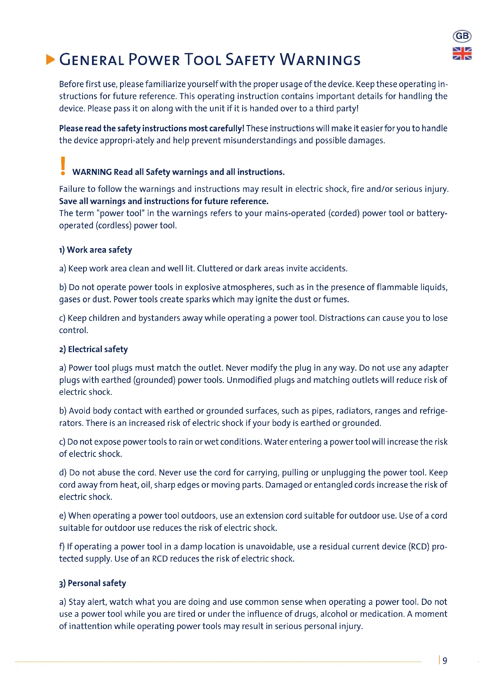 Before first use, please familiarize yourself with the proper usage of the device. Keep these operating in- structions for future reference. This operating instruction contains important details for handling the device. Please pass it on along with the unit if it is handed over to a third party! Please read the safety instructions most carefully! These instructions will make it easier for you to handle the device appropri-ately and help prevent misunderstandings and possible damages. ! WARNING Read all Safety warnings and all instructions. Failure to follow the warnings and instructions may result in electric shock, fire and/or serious injury. Save all warnings and instructions for future reference. The term "power tool" in the warnings refers to your mains-operated (corded) power tool or battery- operated (cordless) power tool.
