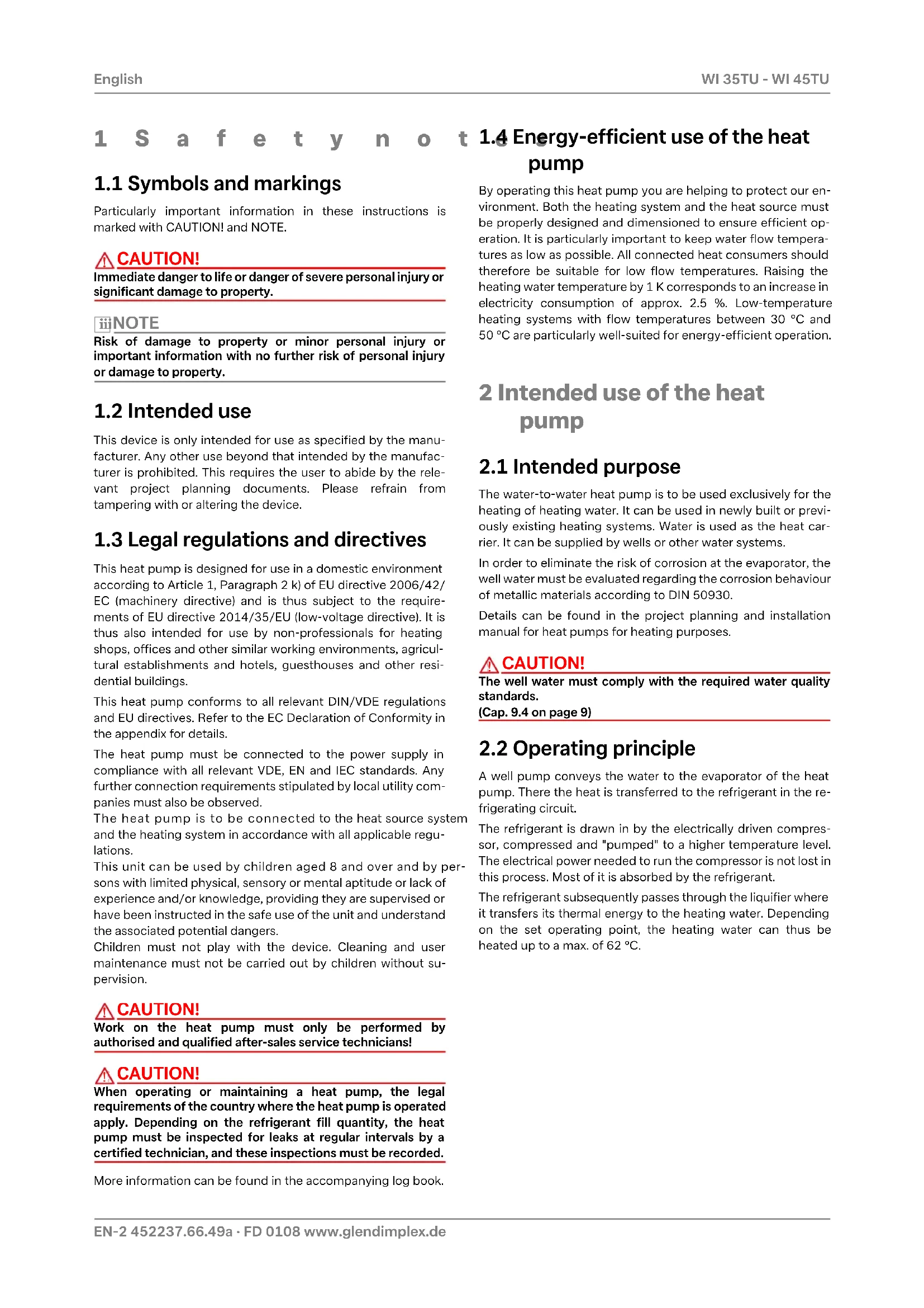 -EN-10 452237.66.49a · FD 0108 www.glendimplex.de English WI 35TU - WI 45TU 10 Faults / troubleshooting This heat pump is a quality product and is designed for trouble- free operation. In the event that a fault should occur, it will be indicated on the heat pump manager display. In this case, con- sult the "Faults and troubleshooting" page in the operating in- structions of the heat pump manager. If you cannot correct the fault yourself, please contact your after-sales service technician. CAUTION!