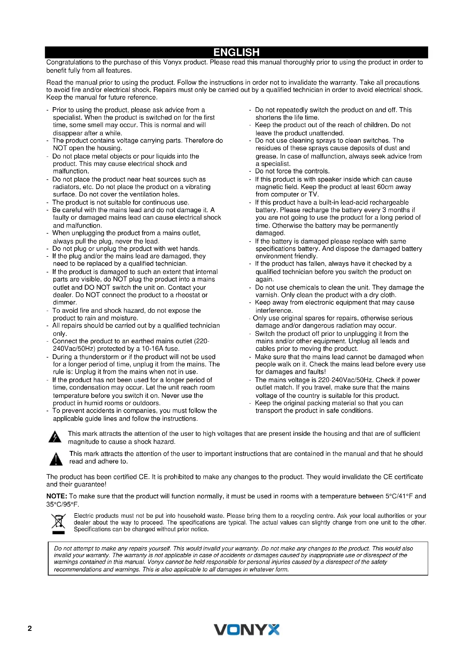 V1.32 ENGLISH Congratulations to the purchase of this Vonyx product. Please read this manual thoroughly prior to using the product in order to benefit fully from all features. Read the manual prior to using the product. Follow the instructions in order not to invalidate the warranty. Take all precautions to avoid fire and/or electrical shock. Repairs must only be carried out by a qualified technician in order to avoid electrical shock. Keep the manual for future reference. - Prior to using the product, please ask advice from a specialist. When the product is switched on for the first time, some smell may occur. This is normal and will disappear after a while. - The product contains voltage carrying parts. Therefore do NOT open the housing. - Do not place metal objects or pour liquids into the product. This may cause electrical shock and malfunction. - Do not place the product near heat sources such as radiators, etc. Do not place the product on a vibrating surface. Do not cover the ventilation holes. - The product is not suitable for continuous use. - Be careful with the mains lead and do not damage it. A faulty or damaged mains lead can cause electrical shock and malfunction. - When unplugging the product from a mains outlet, always pull the plug, never the lead. - Do not plug or unplug the product with wet hands. - If the plug and/or the mains lead are damaged, they need to be replaced by a qualified technician. - If the product is damaged to such an extent that internal parts are visible, do NOT plug the product into a mains outlet and DO NOT switch the unit on. Contact your dealer. Do NOT connect the product to a rheostat or dimmer. - To avoid fire and shock hazard, do not expose the product to rain and moisture. - All repairs should be carried out by a qualified technician only. - Connect the product to an earthed mains outlet (220- 240Vac/50Hz) protected by a 10-16A fuse. - During a thunderstorm or if the product will not be used for a longer period of time, unplug it from the mains. The rule is: Unplug it from the mains when not in use. - If the product has not been used for a longer period of time, condensation may occur. Let the unit reach room temperature before you switch it on. Never use the product in humid rooms or outdoors. - To prevent accidents in companies, you must follow the applicable guide lines and follow the instructions. - Do not repeatedly switch the product on and off. This shortens the life time. - Keep the product out of the reach of children. Do not leave the product unattended. - Do not use cleaning sprays to clean switches. The residues of these sprays cause deposits of dust and grease. In case of malfunction, always seek advice from a specialist. - Do not force the controls. - If this product is with speaker inside which can cause magnetic field. Keep the product at least 60cm away from computer or TV. - If this product have a built-in lead-acid rechargeable battery. Please recharge the battery every 3 months if you are not going to use the product for a long period of time. Otherwise the battery may be permanently damaged. - If the battery is damaged please replace with same specifications battery. And dispose the damaged battery environment friendly. - If the product has fallen, always have it checked by a qualified technician before you switch the product on again. - Do not use chemicals to clean the unit. They damage the varnish. Only clean the product with a dry cloth. - Keep away from electronic equipment that may cause interference. - Only use original spares for repairs, otherwise serious damage and/or dangerous radiation may occur. - Switch the product off prior to unplugging it from the mains and/or other equipment. Unplug all leads and cables prior to moving the product. - Make sure that the mains lead cannot be damaged when people walk on it. Check the mains lead before every use for damages and faults! - The mains voltage is 220-240Vac/50Hz. Check if power outlet match. If you travel, make sure that the mains voltage of the country is suitable for this product. - Keep the original packing material so that you can transport the product in safe conditions. This mark attracts the attention of the user to high voltages that are present inside the housing and that are of sufficient magnitude to cause a shock hazard. This mark attracts the attention of the user to important instructions that are contained in the manual and that he should read and adhere to. The product has been certified CE. It is prohibited to make any changes to the product. They would invalidate the CE certificate and their guarantee! NOTE: To make sure that the product will function normally, it must be used in rooms with a temperature between 5°C/41°F and 35°C/95°F. Electric products must not be put into household waste. Please bring them to a recycling centre. Ask your local authorities or your dealer about the way to proceed. The specifications are typical. The actual values can slightly change from one unit to the other. Specifications can be changed without prior notice.