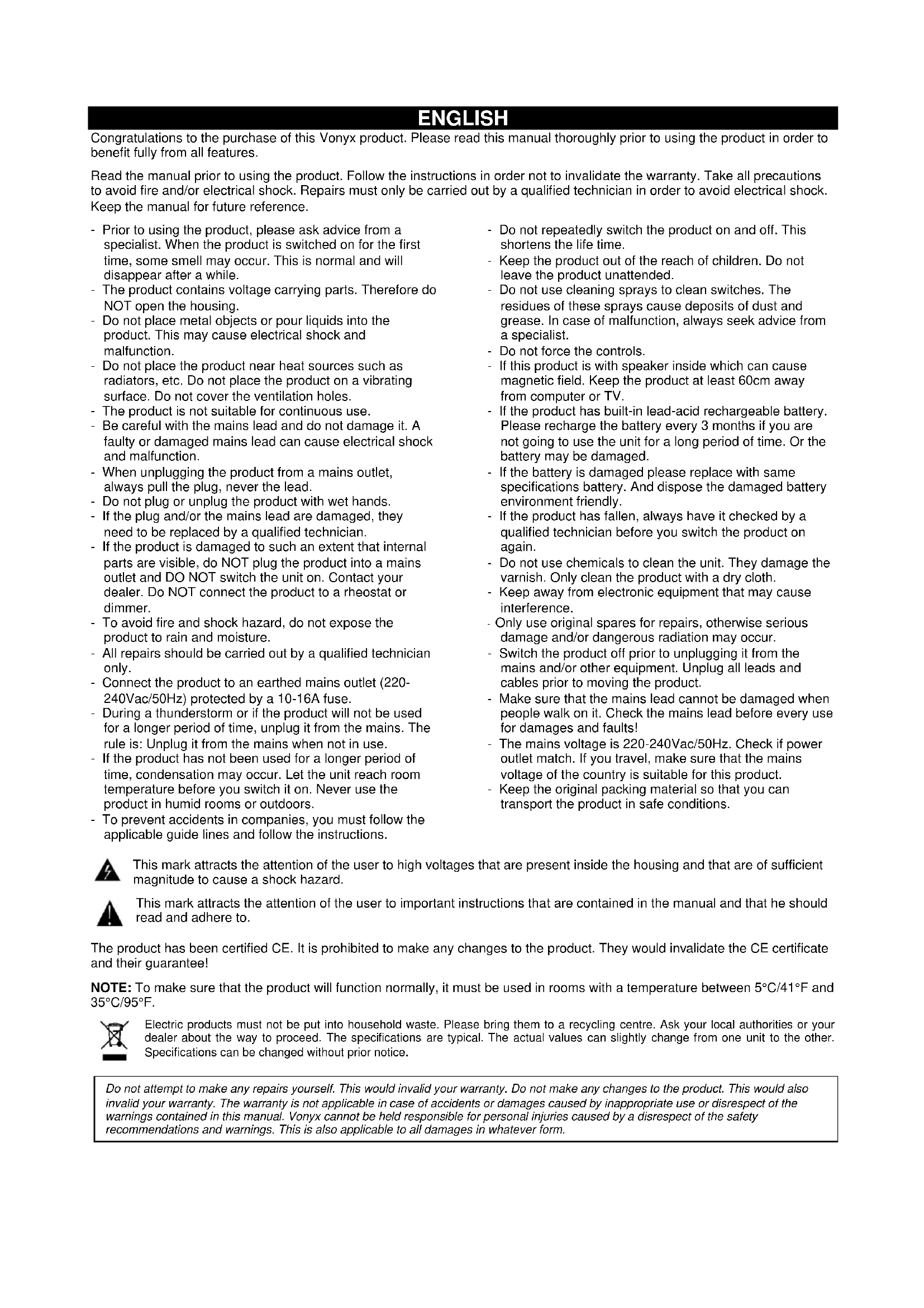V1.0ENGLISH Congratulations to the purchase of this Vonyx product. Please read this manual thoroughly prior to using the product in order to benefit fully from all features. Read the manual prior to using the product. Follow the instructions in order not to invalidate the warranty. Take all precautions to avoid fire and/or electrical shock. Repairs must only be carried out by a qualified technician in order to avoid electrical shock. Keep the manual for future reference. - Prior to using the product, please ask advice from a specialist. When the product is switched on for the first time, some smell may occur. This is normal and will disappear after a while. - The product contains voltage carrying parts. Therefore do NOT open the housing. - Do not place metal objects or pour liquids into the product. This may cause electrical shock and malfunction. - Do not place the product near heat sources such as radiators, etc. Do not place the product on a vibrating surface. Do not cover the ventilation holes. - The product is not suitable for continuous use. - Be careful with the mains lead and do not damage it. A faulty or damaged mains lead can cause electrical shock and malfunction. - When unplugging the product from a mains outlet, always pull the plug, never the lead. - Do not plug or unplug the product with wet hands. - If the plug and/or the mains lead are damaged, they need to be replaced by a qualified technician. - If the product is damaged to such an extent that internal parts are visible, do NOT plug the product into a mains outlet and DO NOT switch the unit on. Contact your dealer. Do NOT connect the product to a rheostat or dimmer. - To avoid fire and shock hazard, do not expose the product to rain and moisture. - All repairs should be carried out by a qualified technician only. - Connect the product to an earthed mains outlet (220- 240Vac/50Hz) protected by a 10-16A fuse. - During a thunderstorm or if the product will not be used for a longer period of time, unplug it from the mains. The rule is: Unplug it from the mains when not in use. - If the product has not been used for a longer period of time, condensation may occur. Let the unit reach room temperature before you switch it on. Never use the product in humid rooms or outdoors. - To prevent accidents in companies, you must follow the applicable guide lines and follow the instructions. - Do not repeatedly switch the product on and off. This shortens the life time. - Keep the product out of the reach of children. Do not leave the product unattended. - Do not use cleaning sprays to clean switches. The residues of these sprays cause deposits of dust and grease. In case of malfunction, always seek advice from a specialist. - Do not force the controls. - If this product is with speaker inside which can cause magnetic field. Keep the product at least 60cm away from computer or TV. - If the product has built-in lead-acid rechargeable battery. Please recharge the battery every 3 months if you are not going to use the unit for a long period of time. Or the battery may be damaged. - If the battery is damaged please replace with same specifications battery. And dispose the damaged battery environment friendly. - If the product has fallen, always have it checked by a qualified technician before you switch the product on again. - Do not use chemicals to clean the unit. They damage the varnish. Only clean the product with a dry cloth. - Keep away from electronic equipment that may cause interference. - Only use original spares for repairs, otherwise serious damage and/or dangerous radiation may occur. - Switch the product off prior to unplugging it from the mains and/or other equipment. Unplug all leads and cables prior to moving the product. - Make sure that the mains lead cannot be damaged when people walk on it. Check the mains lead before every use for damages and faults! - The mains voltage is 220-240Vac/50Hz. Check if power outlet match. If you travel, make sure that the mains voltage of the country is suitable for this product. - Keep the original packing material so that you can transport the product in safe conditions. This mark attracts the attention of the user to high voltages that are present inside the housing and that are of sufficient magnitude to cause a shock hazard. This mark attracts the attention of the user to important instructions that are contained in the manual and that he should read and adhere to. The product has been certified CE. It is prohibited to make any changes to the product. They would invalidate the CE certificate and their guarantee! NOTE: To make sure that the product will function normally, it must be used in rooms with a temperature between 5°C/41°F and 35°C/95°F. Electric products must not be put into household waste. Please bring them to a recycling centre. Ask your local authorities or your dealer about the way to proceed. The specifications are typical. The actual values can slightly change from one unit to the other. Specifications can be changed without prior notice.