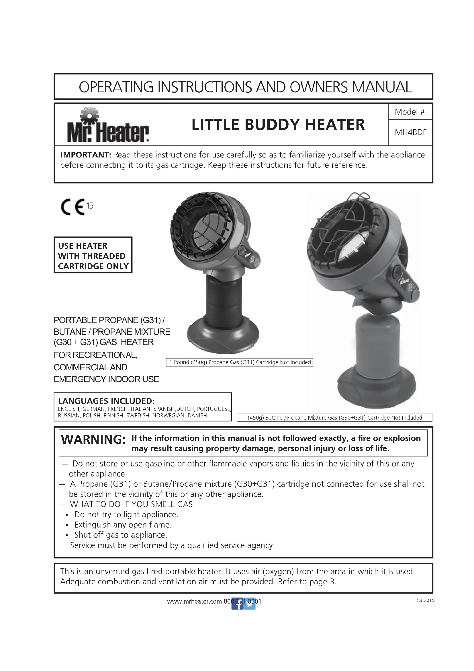 USE ONLY MANUFACTURERÊS REPLACEMENT PARTS. USE OF ANY OTHER PARTS COULD CAUSE INJURY OR DEATH. REPLACEMENT PARTS ARE ONLY AVAILABLE DIRECT FROM THE FACTORY AND MUST BE INSTALLED BY A QUALIFIED SERVICE AGENCY. PARTS ORDERING INFORMATION: PURCHASING: Accessories may be purchased at www.mrheater.com and local dealers FOR INFORMATION REGARDING SERVICE VISIT: WWW.mrheater.com Our office hours are 8:00 AM – 5:00 PM, EST, Monday through Friday. You can chat with technical representative via the website: www.mrheater.com Please include the model number, date of purchase, and description of problem in all communication. LIMITED WARRANTY Mr. Heater, Inc. warranties its heaters and accessories to be free from defects in material and workmanship for a period of 1 year from date of purchase. Mr. Heater, Inc. will repair or replace this product free of charge if it has been proven to be defective within the 1-year period, and is returned to the retailer with proof of purchase within the warranty period. READ INSTRUCTIONS CAREFULLY: Read and follow all instructions. Place instructions in a safe place for future reference. Do not allow anyone who has not read these instructions to assemble, light, adjust or operate the heater. MH4BDF Model # PRODUCT REGISTRATION: Thank you for your purchase. Please log in to http://www.egiregistration.com to register your product. LITTLE BUDDY HEATERwww.mrheater.com 800-251-0001CB 2015 Wenn die Informationen in dieser Anleitung nicht genau befolgt werden, kann dies zu Feuer oder Explosion führen und Sachschäden, Verletzungen oder Tod verursachen. WARNUNG: