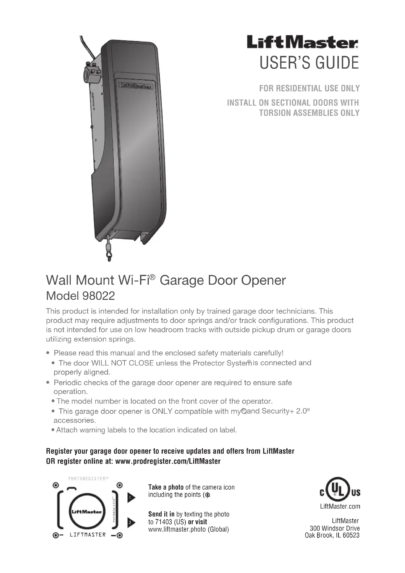 - LIFTMASTER Send it in by texting the photo to 71403 (US) or visitwww.liftmaster.photo (Global)LiftMaster300 Windsor DriveOak Brook, IL 605232 For the complete manual visit LiftMaster.com/Customer-Support Contents Important Safety Instructions p. 3