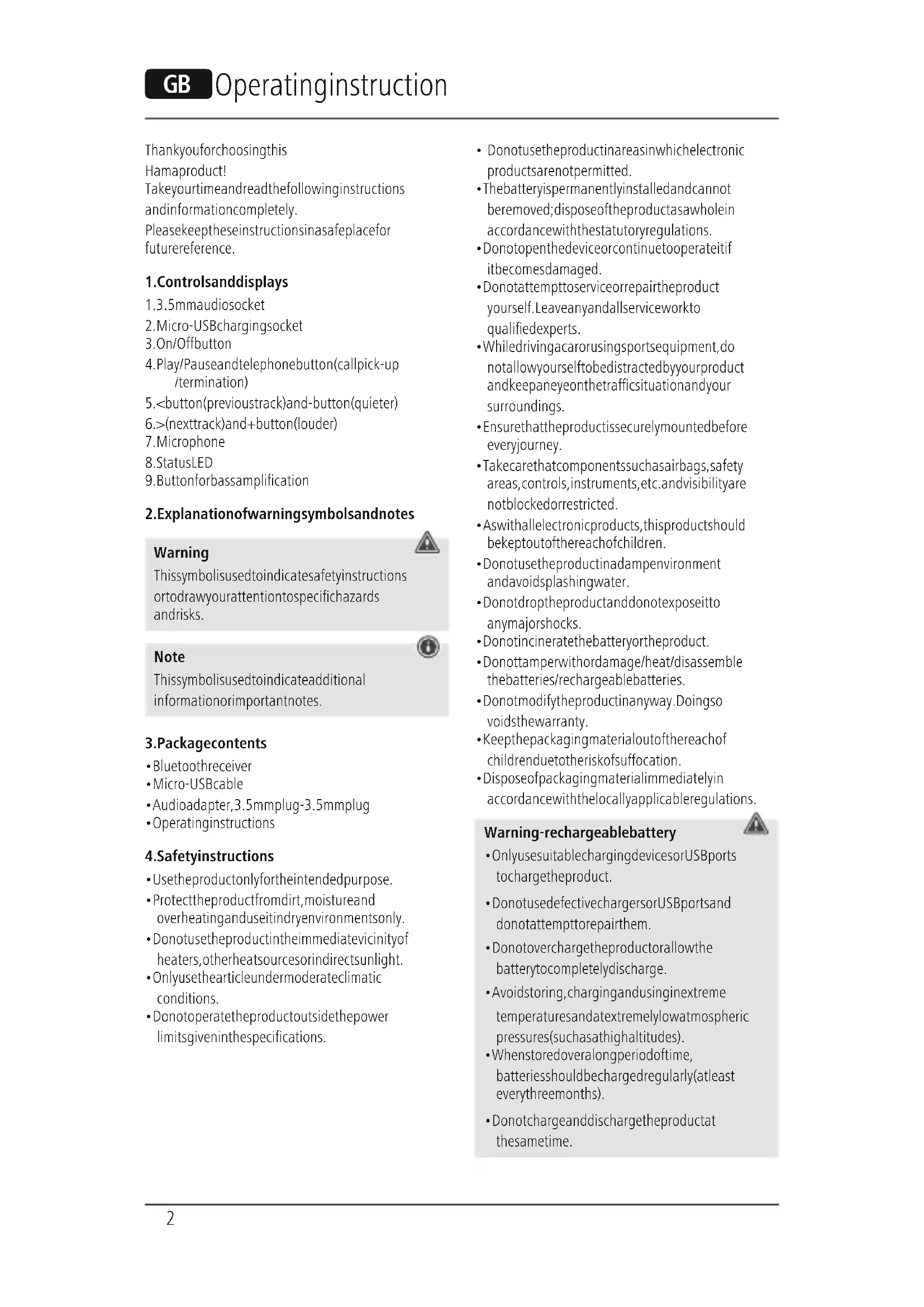 Hama GmbH & Co KG assumes no liability and provides no warranty for damage resulting from improper installation/mounting, improper use of the product or from failure to observe the operating instructions and/or safety notes. 10.Technical data Connection 3.5 mm jack plug Max. range 7 m Power supply Integrated Li-Po 150 mAh rechargeable battery Bluetooth