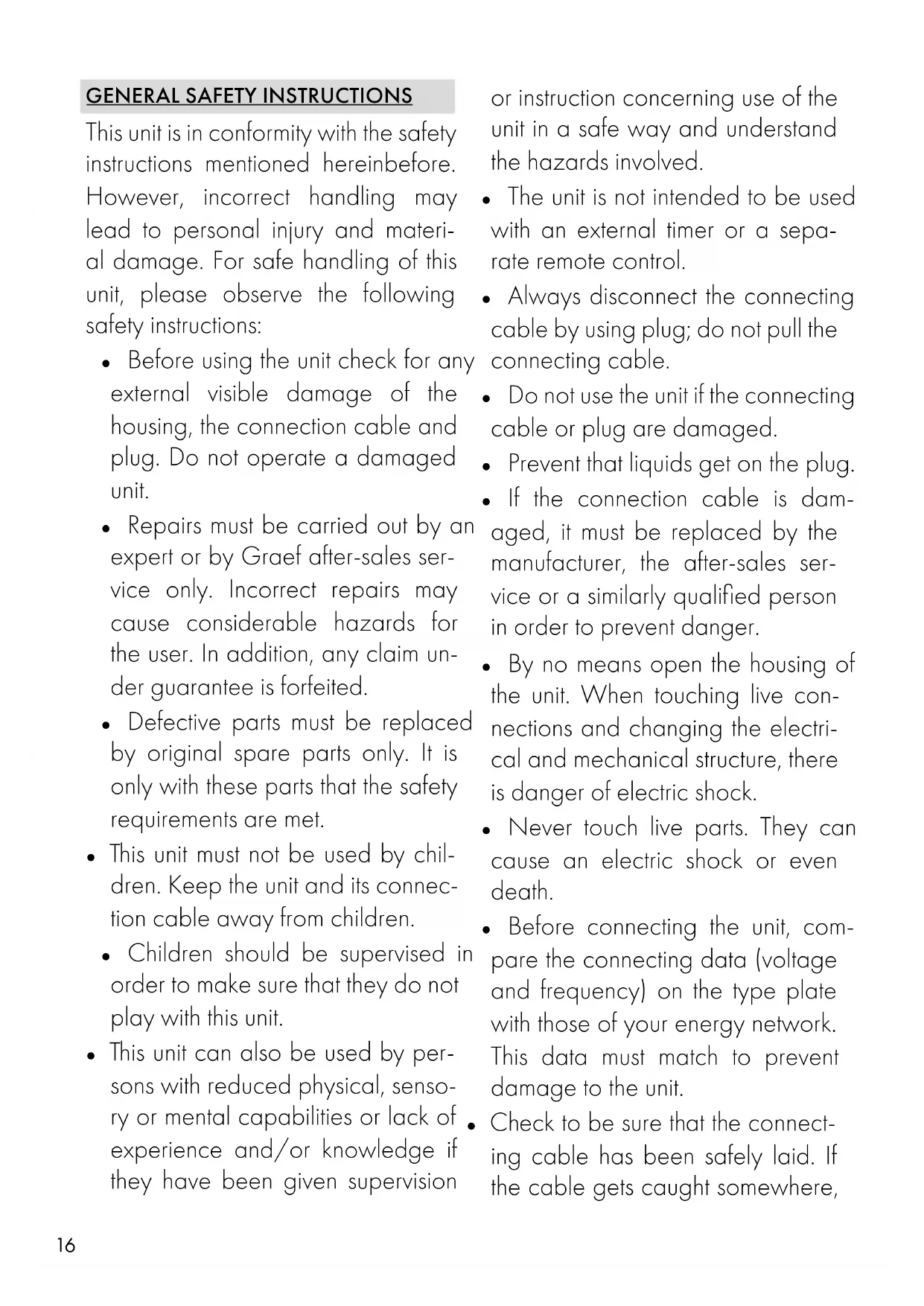 This unit is in conformity with the safety instructions mentioned hereinbefore. However, incorrect handling may lead to personal injury and materi- al damage. For safe handling of this unit, please observe the following safety instructions: ● Before using the unit check for any external visible damage of the housing, the connection cable and plug. Do not operate a damaged unit. ● Repairs must be carried out by an expert or by Graef after-sales ser- vice only. Incorrect repairs may cause considerable hazards for the user. In addition, any claim un- der guarantee is forfeited. ● Defective parts must be replaced by original spare parts only. It is only with these parts that the safety requirements are met. ● This unit must not be used by chil- dren. Keep the unit and its connec- tion cable away from children. ● Children should be supervised in order to make sure that they do not play with this unit. ● This unit can also be used by per- sons with reduced physical, senso- ry or mental capabilities or lack of experience and/or knowledge if they have been given supervision or instruction concerning use of the unit in a safe way and understand the hazards involved. ● The unit is not intended to be used with an external timer or a sepa- rate remote control. ● Always disconnect the connecting cable by using plug; do not pull the connecting cable. ● Do not use the unit if the connecting cable or plug are damaged. ● Prevent that liquids get on the plug. ● If the connection cable is dam- aged, it must be replaced by the manufacturer, the after-sales ser- vice or a similarly qualified person in order to prevent danger. ● By no means open the housing of the unit. When touching live con- nections and changing the electri- cal and mechanical structure, there is danger of electric shock. ● Never touch live parts. They can cause an electric shock or even death. ● Before connecting the unit, com- pare the connecting data (voltage and frequency) on the type plate with those of your energy network. This data must match to prevent damage to the unit. ● Check to be sure that the connect- ing cable has been safely laid. If the cable gets caught somewhere,17
