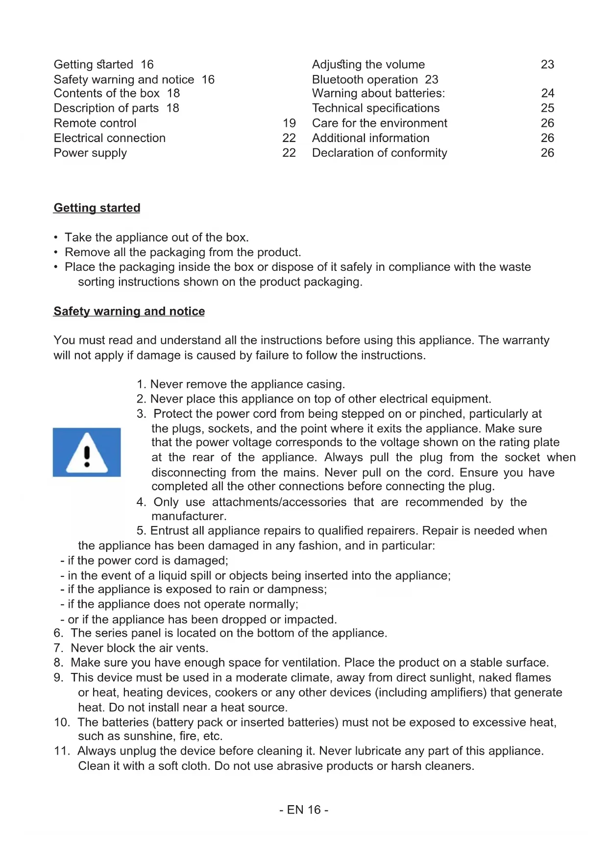 Clean it with a soft cloth. Do not use abrasive products or harsh cleaners. Getting arted 16 Safety warning and notice 16 Contents of the box 18 Description of parts 18 Remote control 19 Electrical connection 22 Power supply 22 Adjuing the volume 23 Bluetooth operation 23 Warning about batteries: 24 Technical specications 25 Care for the environment 26 Additional information 26 Declaration of conformity 26- EN 17 -