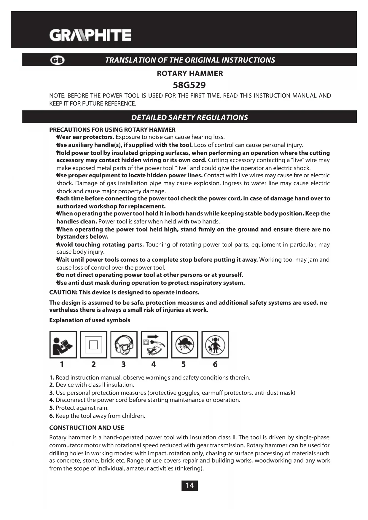 Rotary hammer is a hand-operated power tool with insulation class II. The tool is driven by single-phase commutator motor with rotational speed reduced with gear transmission. Rotary hammer can be used for drilling holes in working modes: with impact, rotation only, chasing or surface processing of materials such as concrete, stone, brick etc. Range of use covers repair and building works, woodworking and any work from the scope of individual, amateur activities (tinkering).15 Use the power tool in accordance with the manufacturer’s instructions only.