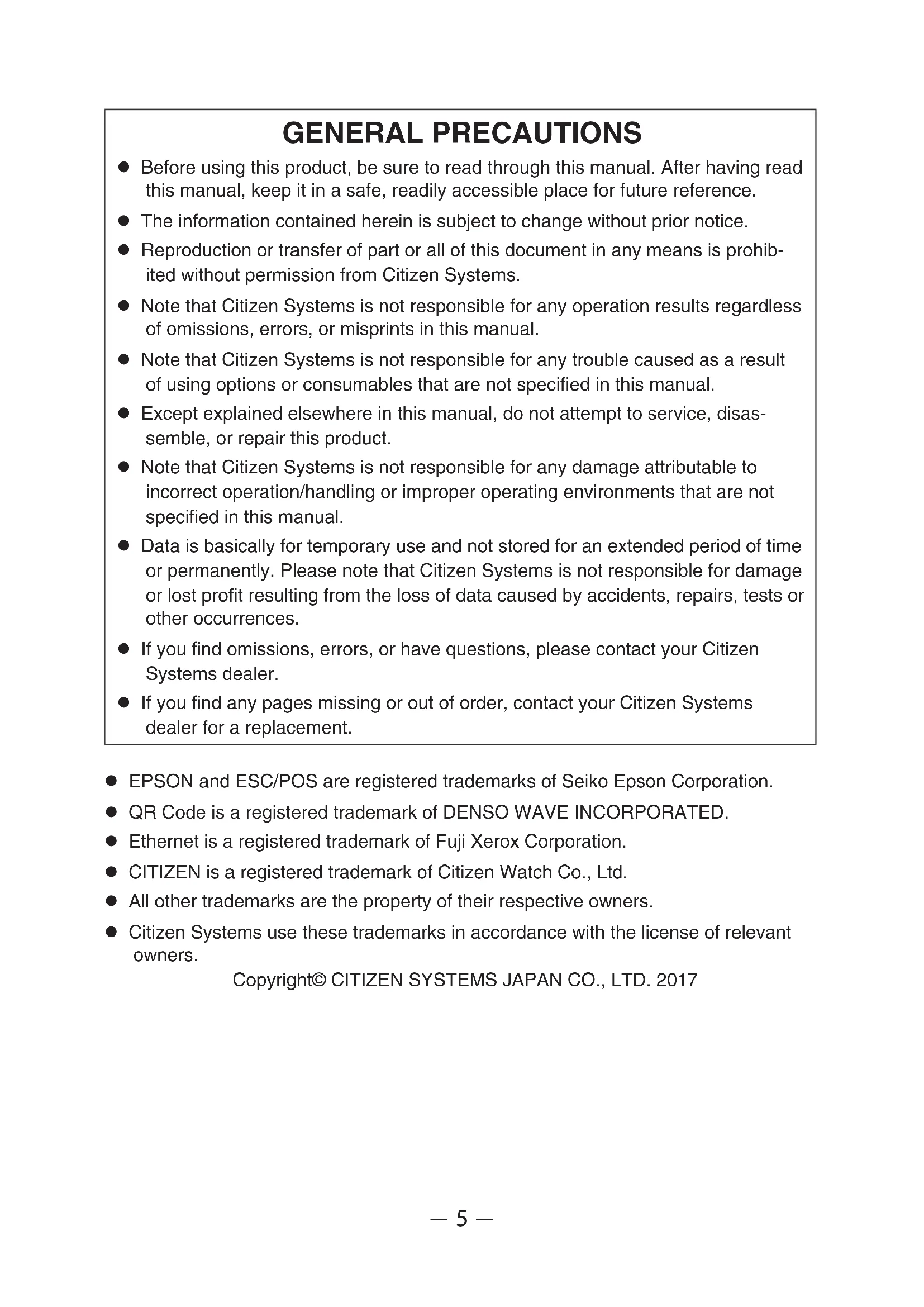 GENERAL PRECAUTIONS Before using this product, be sure to read through this manual. After having read this manual, keep it in a safe, readily accessible place for future reference. The information contained herein is subject to change without prior notice. Reproduction or transfer of part or all of this document in any means is prohib- ited without permission from Citizen Systems. Note that Citizen Systems is not responsible for any operation results regardless of omissions, errors, or misprints in this manual. Note that Citizen Systems is not responsible for any trouble caused as a result of using options or consumables that are not specied in this manual. Except explained elsewhere in this manual, do not attempt to service, disas- semble, or repair this product. Note that Citizen Systems is not responsible for any damage attributable to incorrect operation/handling or improper operating environments that are not specied in this manual. Data is basically for temporary use and not stored for an extended period of time or permanently. Please note that Citizen Systems is not responsible for damage or lost prot resulting from the loss of data caused by accidents, repairs, tests or other occurrences. If you nd omissions, errors, or have questions, please contact your Citizen Systems dealer. If you nd any pages missing or out of order, contact your Citizen Systems dealer for a replacement. EPSON and ESC/POS are registered trademarks of Seiko Epson Corporation. QR Code is a registered trademark of DENSO WAVE INCORPORATED. Ethernet is a registered trademark of Fuji Xerox Corporation. CITIZEN is a registered trademark of Citizen Watch Co., Ltd. All other trademarks are the property of their respective owners. Citizen Systems use these trademarks in accordance with the license of relevant owners. Copyright© CITIZEN SYSTEMS JAPAN CO., LTD. 20176