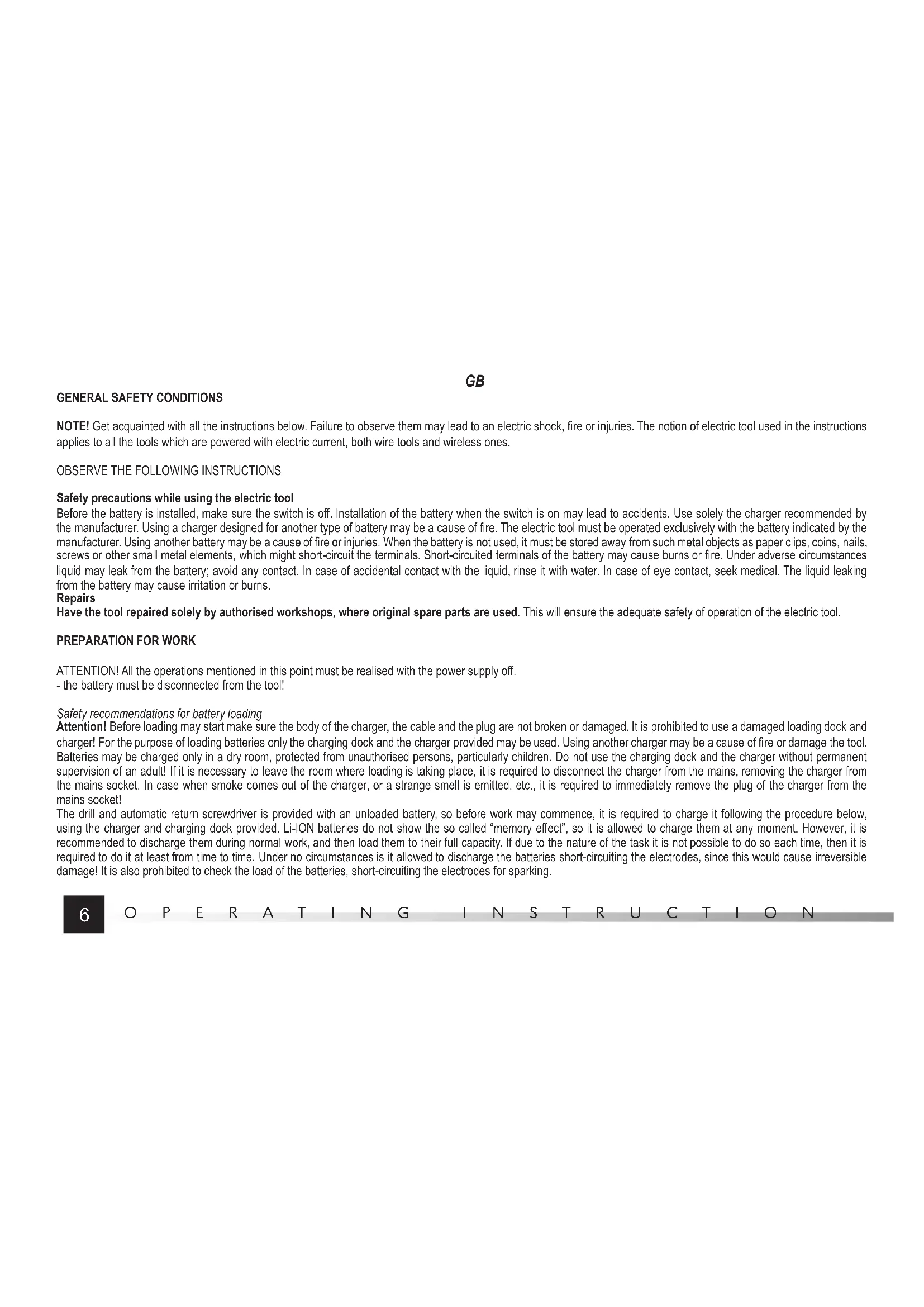 ATTENTION! All the operations mentioned in this point must be realised with the power supply off . - the battery must be disconnected from the tool! Safety recommendations for battery loading Attention! Before loading may start make sure the body of the charger, the cable and the plug are not broken or damaged. It is prohibited to use a damaged loading dock and charger! For the purpose of loading batteries only the charging dock and the charger provided may be used. Using another charger may be a cause of fi re or damage the tool. Batteries may be charged only in a dry room, protected from unauthorised persons, particularly children. Do not use the charging dock and the charger without permanent supervision of an adult! If it is necessary to leave the room where loading is taking place, it is required to disconnect the charger from the mains, removing the charger from the mains socket. In case when smoke comes out of the charger, or a strange smell is emitted, etc., it is required to immediately remove the plug of the charger from the mains socket! The drill and automatic return screwdriver is provided with an unloaded battery, so before work may commence, it is required to charge it following the procedure below, using the charger and charging dock provided. Li-ION batteries do not show the so called “memory eff ect”, so it is allowed to charge them at any moment. However, it is recommended to discharge them during normal work, and then load them to their full capacity. If due to the nature of the task it is not possible to do so each time, then it is required to do it at least from time to time. Under no circumstances is it allowed to discharge the batteries short-circuiting the electrodes, since this would cause irreversible damage! It is also prohibited to check the load of the batteries, short-circuiting the electrodes for sparking.
