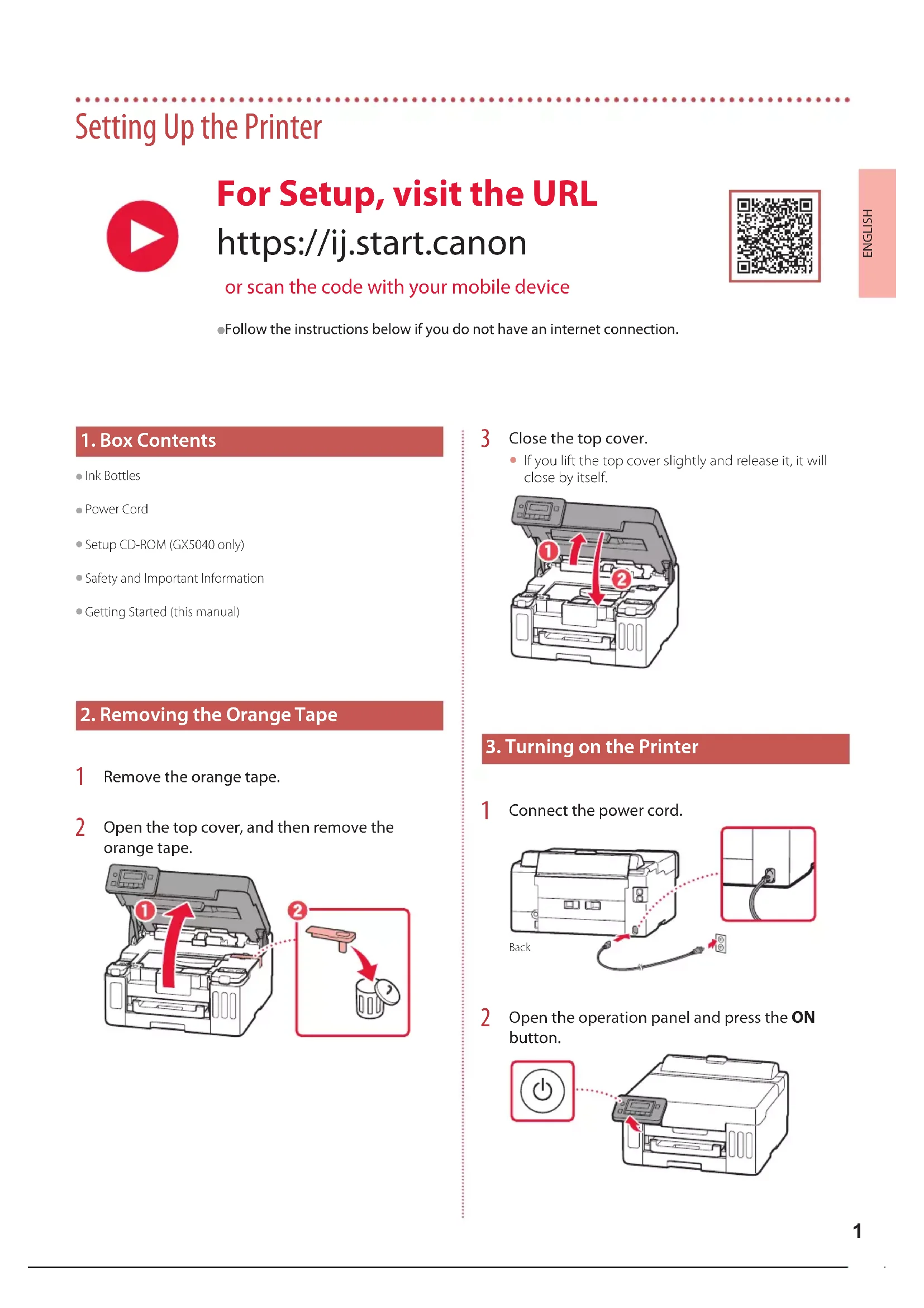 Open the operation panel and press the ON button. For Setup, visit the URL https://ij.start.canon or scan the code with your mobile device