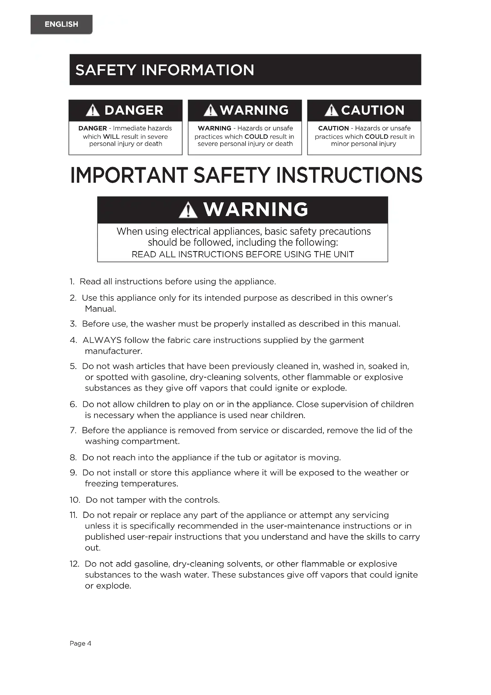 - Do not wash articles that have been previously cleaned in, washed in, soaked in, or spotted with gasoline, dry-cleaning solvents, other flammable or explosive substances as they give off vapors that could ignite or explode.