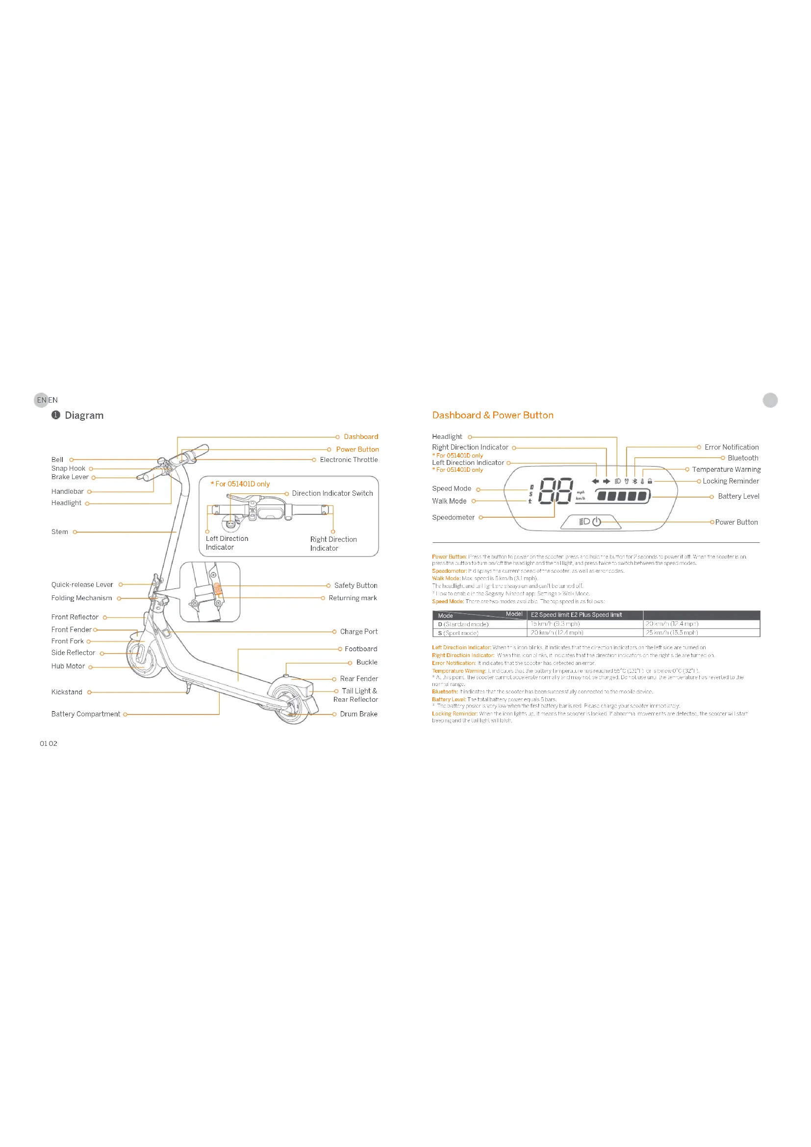 Protection against overvoltage/undervoltage/short circuit/overcur- rent/over temperature Approx. 25 km/h (15.5 mph) Approx. 25 km (15.5 miles) Approx. 20 km (12.4 miles) Approx. 12% Mostly smooth roads or normal asphalt, tarmac roads -10–40°C (14–104°F) -10–50°C (14–122°F) IPX4 Approx. 7.5 h 90 kg (198 lbs) 14–60 years old 130–190 cm (4'3''–6'2'') Tire 051402B Approx. 1070 × 445 × 1140 mm (42.1 × 17.5 × 44.9 in) Approx. 1070 × 445 × 504 mm (42.1 × 17.5 × 19.8 in) Approx. 1070 × 473 × 1140 mm (42.1 × 18.6 × 44.9 in) Approx. 1070 × 473 × 504 mm (42.1 × 18.6 × 19.8 in) Product Rider Machine Battery Motor Charger Ninebot KickScooter E2 051401E Item Parameter Name Model Length × Width × Height Folded: Length × Width × Height Max. Payload Recommended Age Required Height Max. Speed Theoretical Range [1] Typical Range [2] Max. Slope Traversable Terrain Operating Temperature Storage Temperature IP Rating Duration of Charging Nominal Voltage Max. Charging Voltage Charging Temperature Nominal Energy Nominal Capacity Battery Management System Output Power Input Voltage Max. Output Voltage Rated Output Tires Direction Indicators 8.1-inch inner hollow shock-absorbing tires N/A
