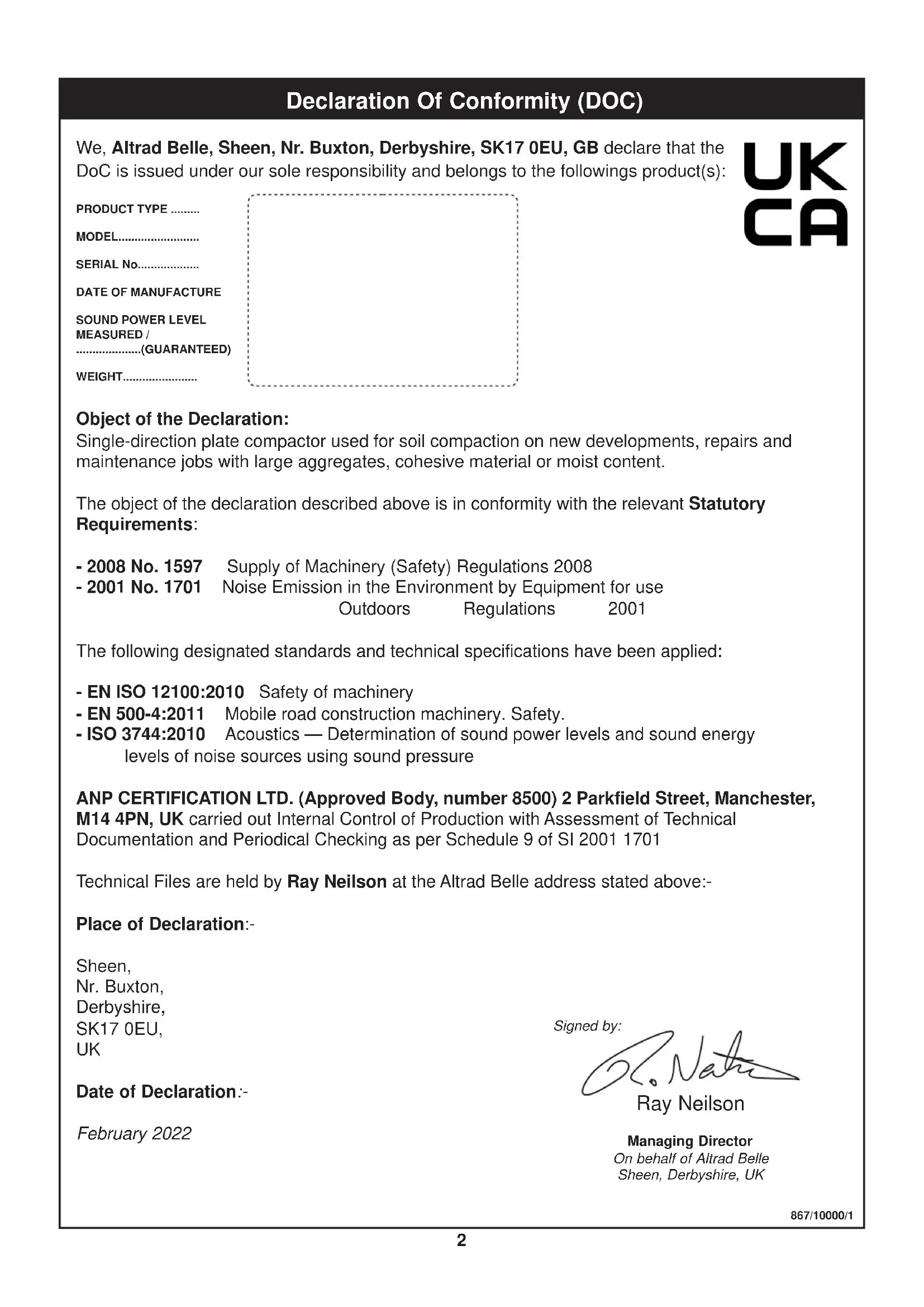 Managing DirectorOn behalf of Altrad BelleSheen, Derbyshire, UK EC Declaration Of Conformity (DOC) Ray Neilson Signed by: We, Altrad Belle, Sheen, Nr. Buxton, Derbyshire, SK17 0EU, GB declare that the DoC is issued under our sole responsibility and belongs to the followings product(s): 866/10000/0_GB GB GB PRODUCT TYPE .....................MODEL.....................................SERIAL No...............................DATE OF MANUFACTURE.....SOUND POWER LEVELMEASURED /....................(GUARANTEED)WEIGHT................................... Object of the Declaration: Single-direction plate compactor used for soil compaction on new developments, repairs and maintenance jobs with large aggregates, cohesive material or moist content. The object of the declaration described above is in conformity with the relevant Union Harmonisation Legislation: - 2006/42/EC New machinery directive - 2000/14/EC Noise - equipment for use outdoors The following harmonised standards and technical specifications have been applied: - EN ISO 12100:2010 Safety of machinery - EN 500-4:2011 Mobile road construction machinery. Safety. - ISO 3744:2010 Acoustics — Determination of sound power levels and sound energy levels of noise sources using sound pressure VINÇOTTE nv/sa (NB0026) carried out Internal Control of Production with Assessment of Technical Documentation and Periodical Checking as per Annex VI of 2000/14/EC Technical Files are held by Hugues Menager at the following address:- Altrad (Group Holding), 125 Rue du Mas Carbonnier, 34000, Montpellier, France. Place of Declaration:- Sheen, Nr. Buxton, Derbyshire, SK17 0EU,