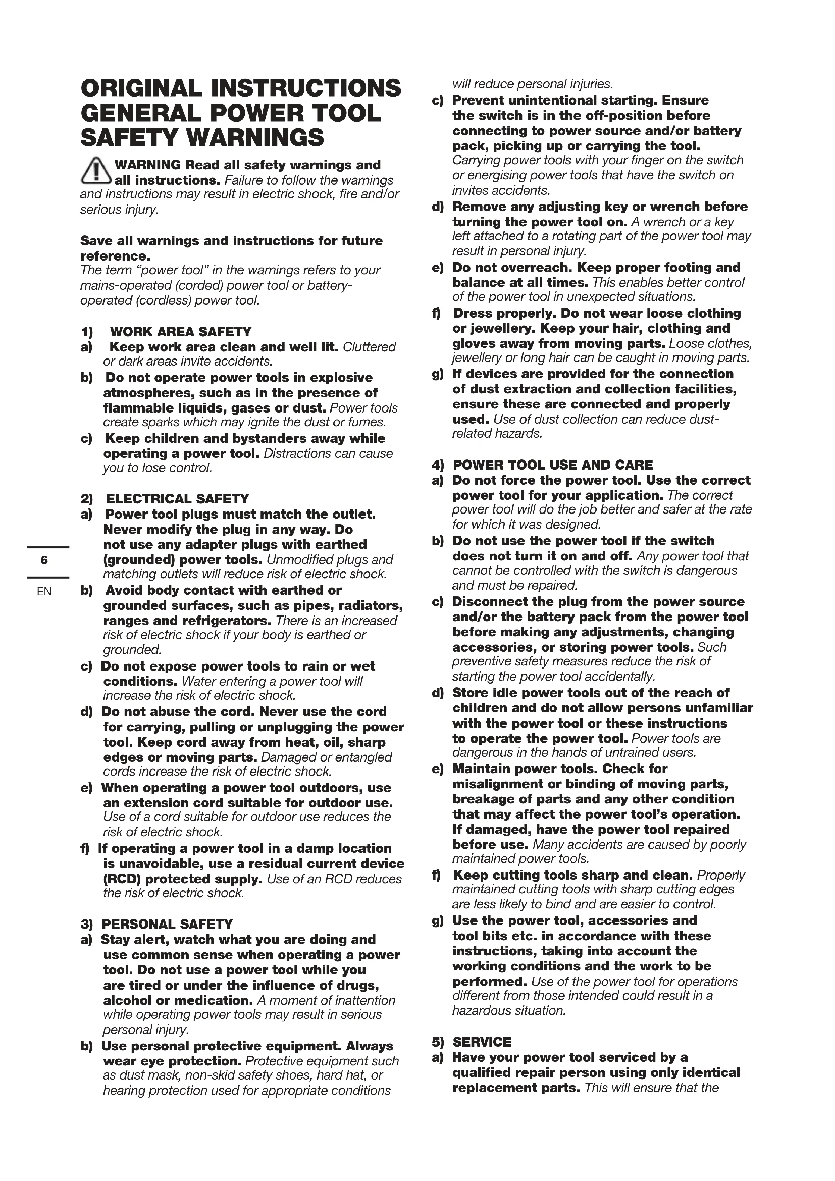 SAFETY WARNINGS WARNING Read all safety warnings and all instructions. Failure to follow the warnings and instructions may result in electric shock, fire and/or serious injury. Save all warnings and instructions for future reference. The term “power tool” in the warnings refers to your mains-operated (corded) power tool or battery- operated (cordless) power tool.