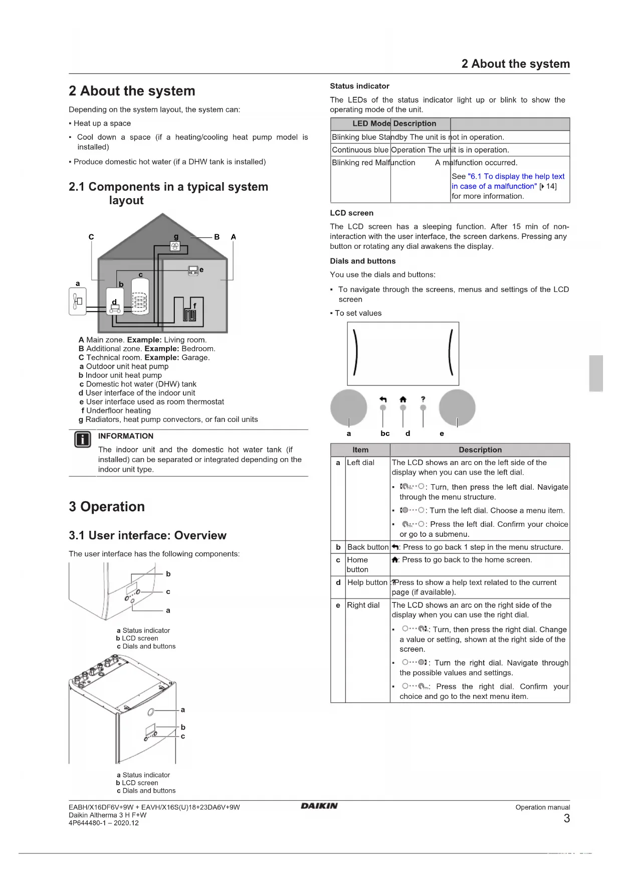 - If yes, make sure that the room where you want to purge air is sufficiently ventilated. Reason: Refrigerant might leak into the water circuit, and subsequently into the room when you purge air from the heat emitters or collectors. 7 Disposal NOTICE Do NOT try to dismantle the system yourself: dismantling of the system, treatment of the refrigerant, oil and other parts MUST comply with applicable legislation. Units MUST be treated at a specialised treatment facility for reuse, recycling and recovery. 8 Glossary DHW = Domestic hot water Hot water used, in any type of building, for domestic purposes. LWT = Leaving water temperature Water temperature at the water outlet of the unit.Inhaltsverzeichnis Betriebsanleitung EABH/X16DF6V+9W + EAVH/X16S(U)18+23DA6V+9WDaikin Altherma 3 H F+W4P644480-1 – 2020.12 Inhaltsverzeichnis 1 Informationen zu diesem Dokument 16 2 Über das System 17