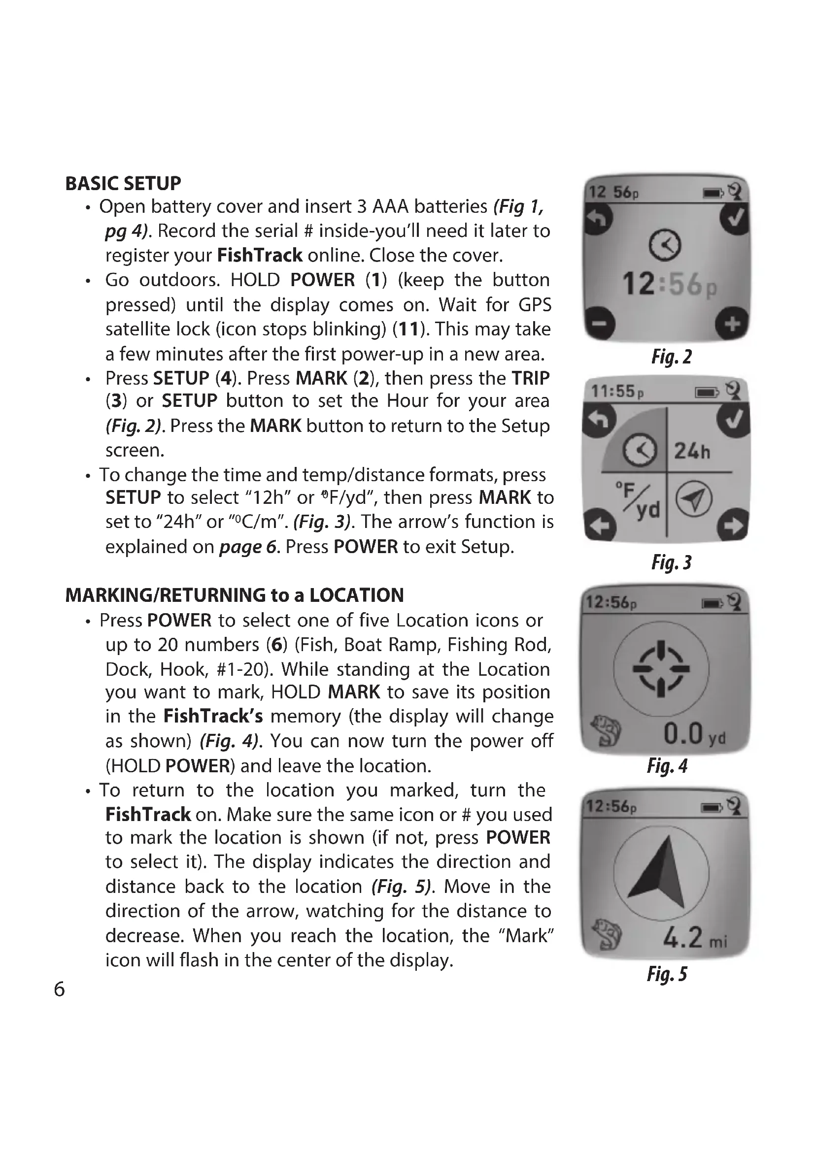 - To return to the location you marked, turn the FishTrack on. Make sure the same icon or # you used to mark the location is shown (if not, press POWER to select it). The display indicates the direction and distance back to the location (Fig. 5). Move in the direction of the arrow, watching for the distance to decrease. When you reach the location, the “Mark” icon will flash in the center of the display. Fig. 2 Fig. 4 Fig. 5 Fig. 37 Fig. 6 Fig. 7