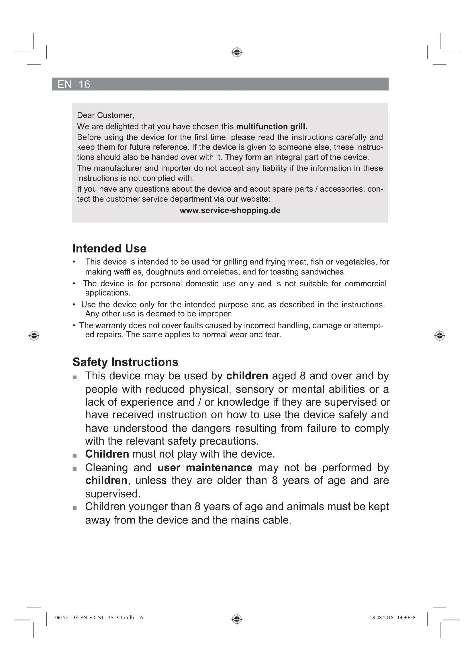- This device is intended to be used for grilling and frying meat, fish or vegetables, for making waffl es, doughnuts and omelettes, and for toasting sandwiches.