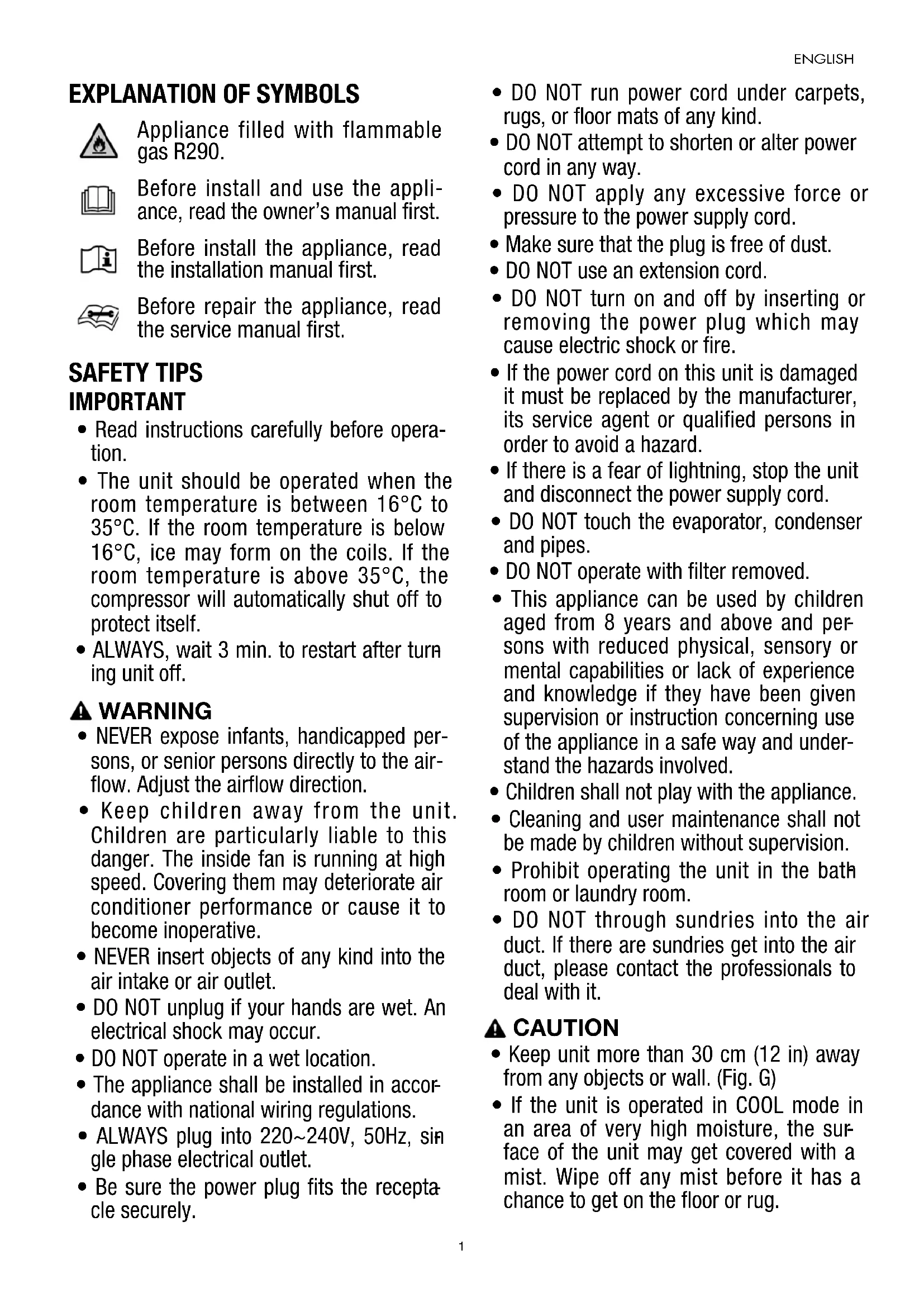 Appliance filled with flammable gas R290. Before install and use the appli- ance, read the owner’s manual first. Before install the appliance, read the installation manual first. Before repair the appliance, read the service manual first. SAFETY TIPS IMPORTANT