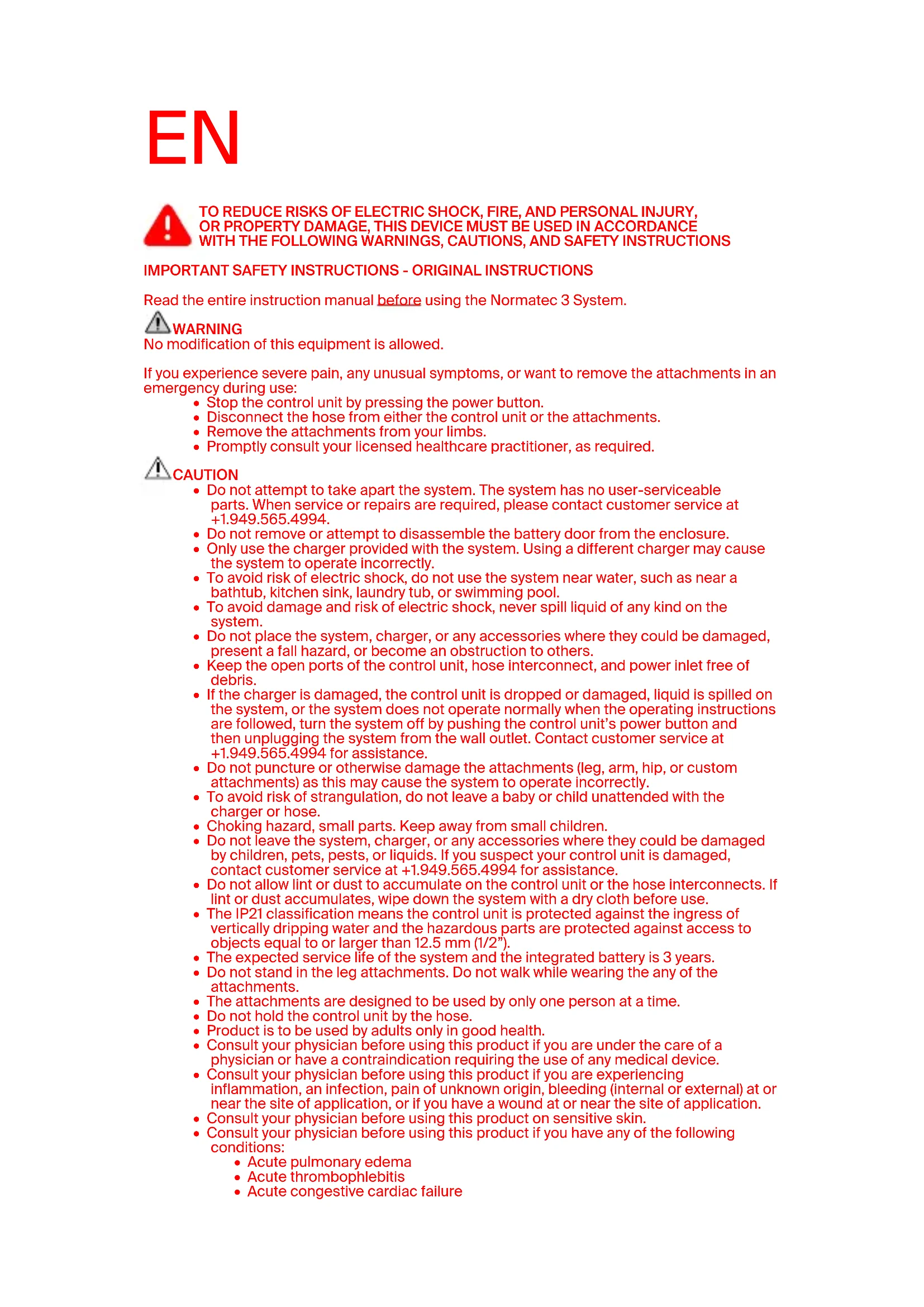 Read the entire instruction manual before using the Normatec 3 System. WARNING No modification of this equipment is allowed. If you experience severe pain, any unusual symptoms, or want to remove the attachments in an emergency during use: