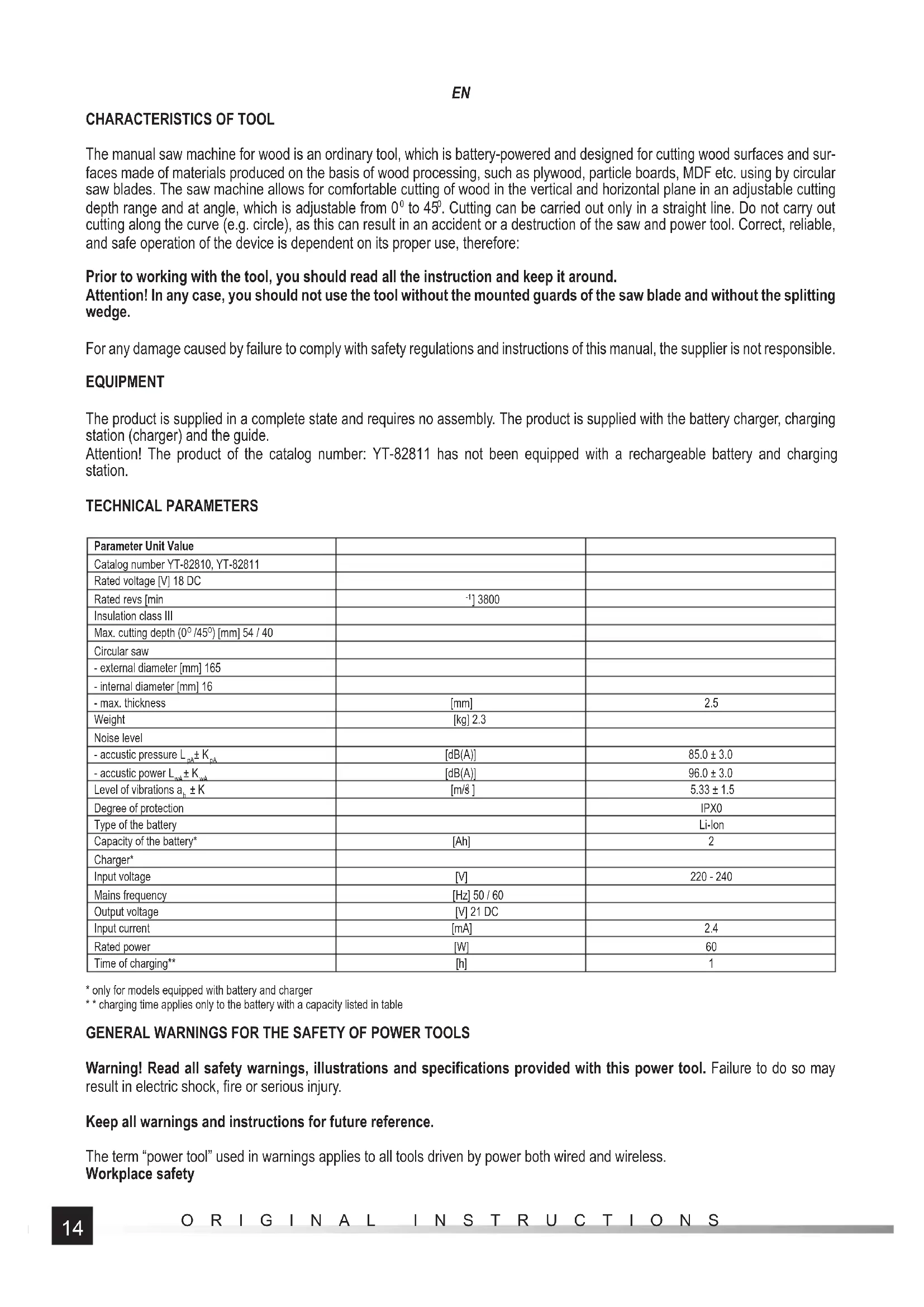 . Cutting can be carried out only in a straight line. Do not carry out cutting along the curve (e.g. circle), as this can result in an accident or a destruction of the saw and power tool. Correct, reliable, and safe operation of the device is dependent on its proper use, therefore: Prior to working with the tool, you should read all the instruction and keep it around. Attention! In any case, you should not use the tool without the mounted guards of the saw blade and without the splitting wedge. For any damage caused by failure to comply with safety regulations and instructions of this manual, the supplier is not responsible. EQUIPMENT The product is supplied in a complete state and requires no assembly. The product is supplied with the battery charger, charging station (charger) and the guide. Attention! The product of the catalog number: YT-82811 has not been equipped with a rechargeable battery and charging station. TECHNICAL PARAMETERS Parameter Unit Value Catalog number YT-82810, YT-82811 Rated voltage [V] 18 DC Rated revs [min