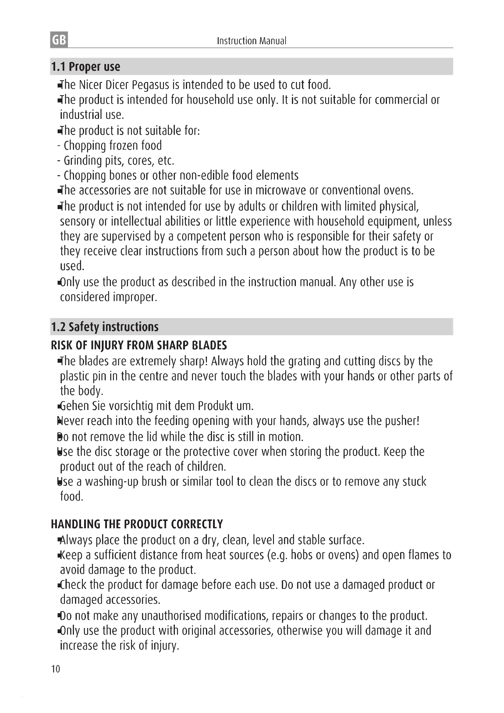 CAUTION! Risk of cutting injuries! The blades are extremely sharp. Always hold parts by the plastic and do not touch the blades with your hands or other body parts under any circumstances. Store the product out of the reach of children and animals.14 Instruction Manual