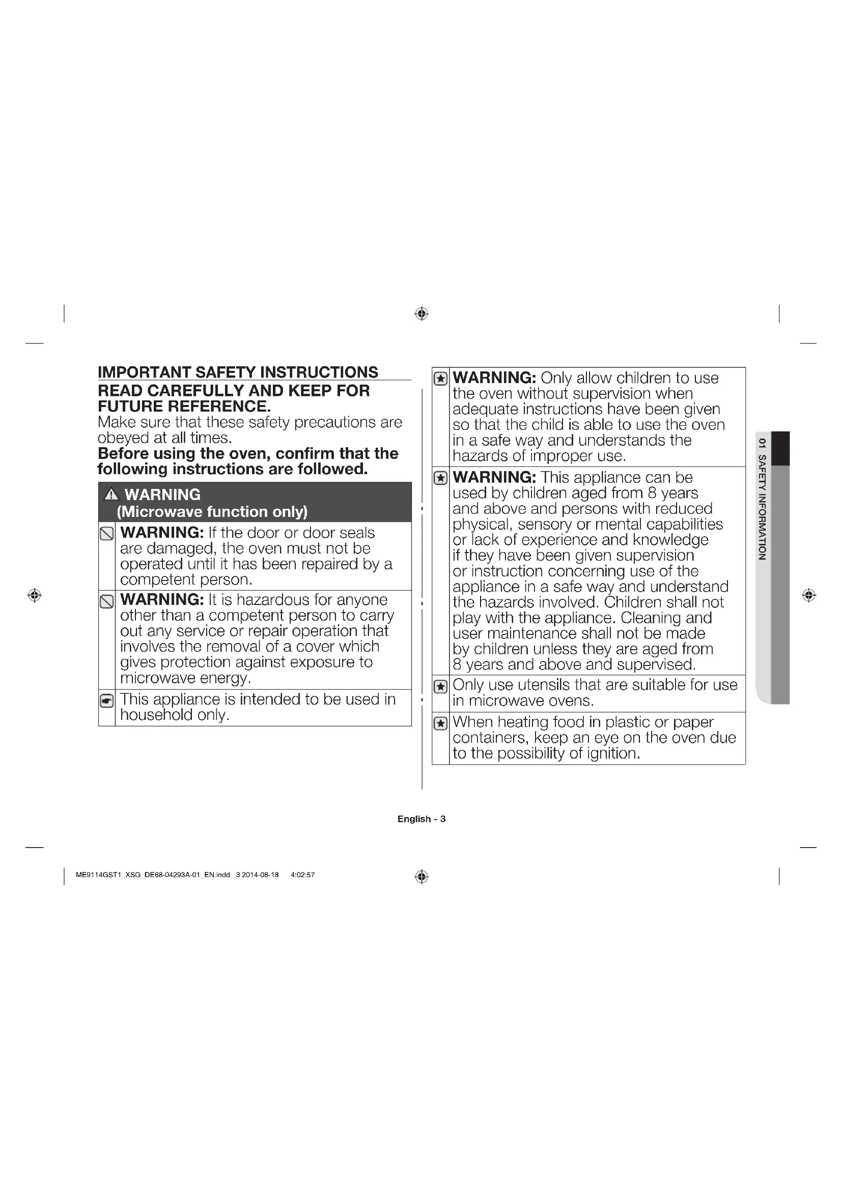 so that plug is accessible. 10 cm behind 20 cm above 10 cm on the side 85 cm of the floor ME9114GST1_XSG_DE68-04293A-01_EN.indd 6 2014-08-18 4:02:57English - 7 01 SAFETY INFORMATION If the supply cord is damaged, it must be replaced by the manufacturer, its service agent or similarly qualified persons in order to avoid a hazard. For your personal safety, plug the cable into a proper AC earthed socket. Do not install the microwave oven in hot or damp surroundings like next to a traditional oven or radiator. The power supply specifications of the oven must be respected and any extension cable used must be of the same standard as the power cable supplied with the oven. Wipe the interior and the door seal with a damp cloth before using your microwave oven for the first time.