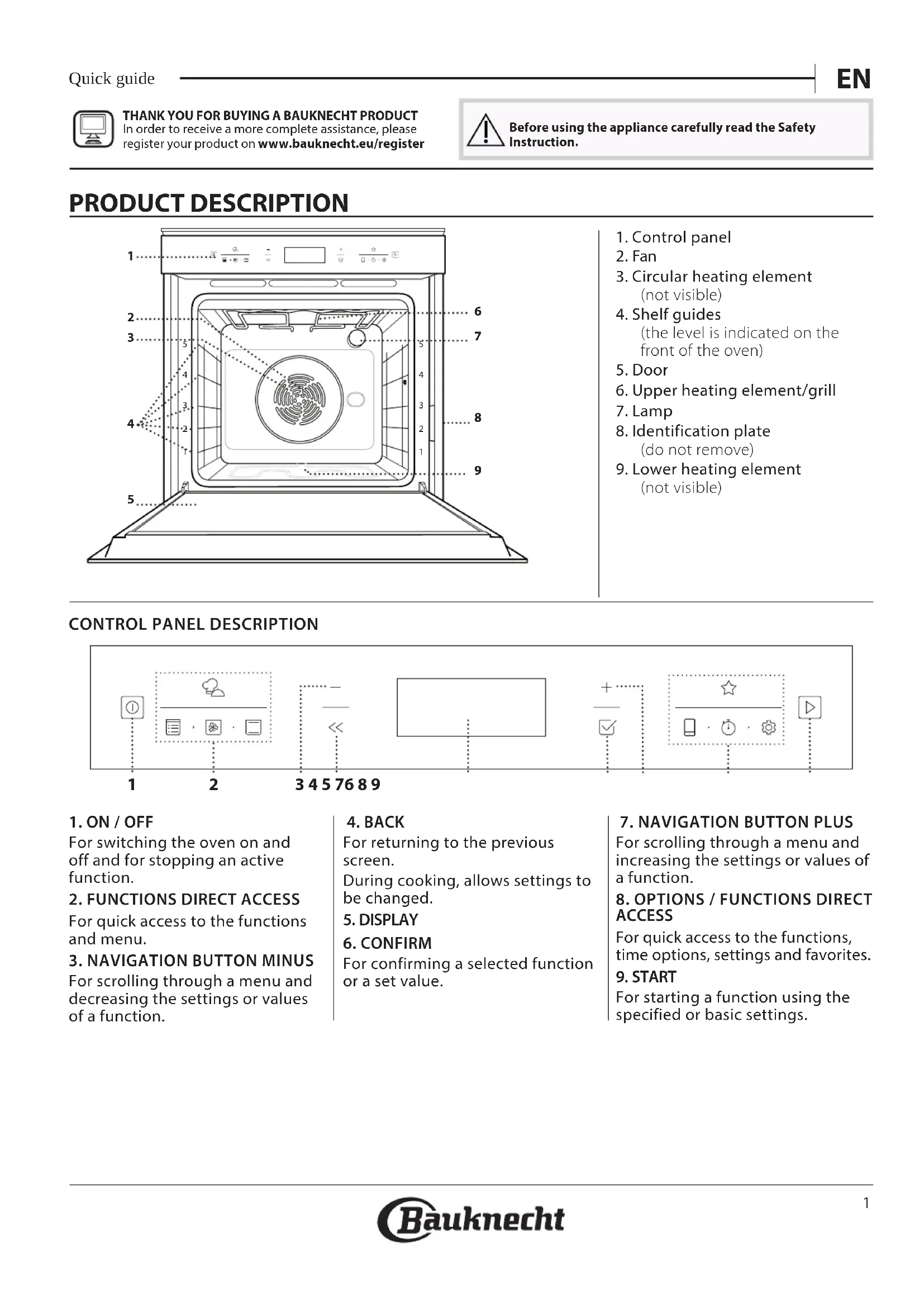 For starting a function using the specified or basic settings. THANK YOU FOR BUYING A BAUKNECHT PRODUCT In order to receive a more complete assistance, please register your product on www.bauknecht.eu/register Before using the appliance carefully read the Safety Instruction.2 ACCESSORIES WIRE SHELF DRIP TRAY BAKING TRAY SLIDING RUNNERS* Use to cook food or as a support for pans, cake tins and other ovenproof items of cookware. Use as an oven tray for cooking meat, sh, vegetables, focaccia, etc. or position underneath the wire shelf to collect cooking juices. Use for cooking all bread and pastry products, but also for roasts, sh en papillote, etc. To facilitate inserting or removing accessories.
