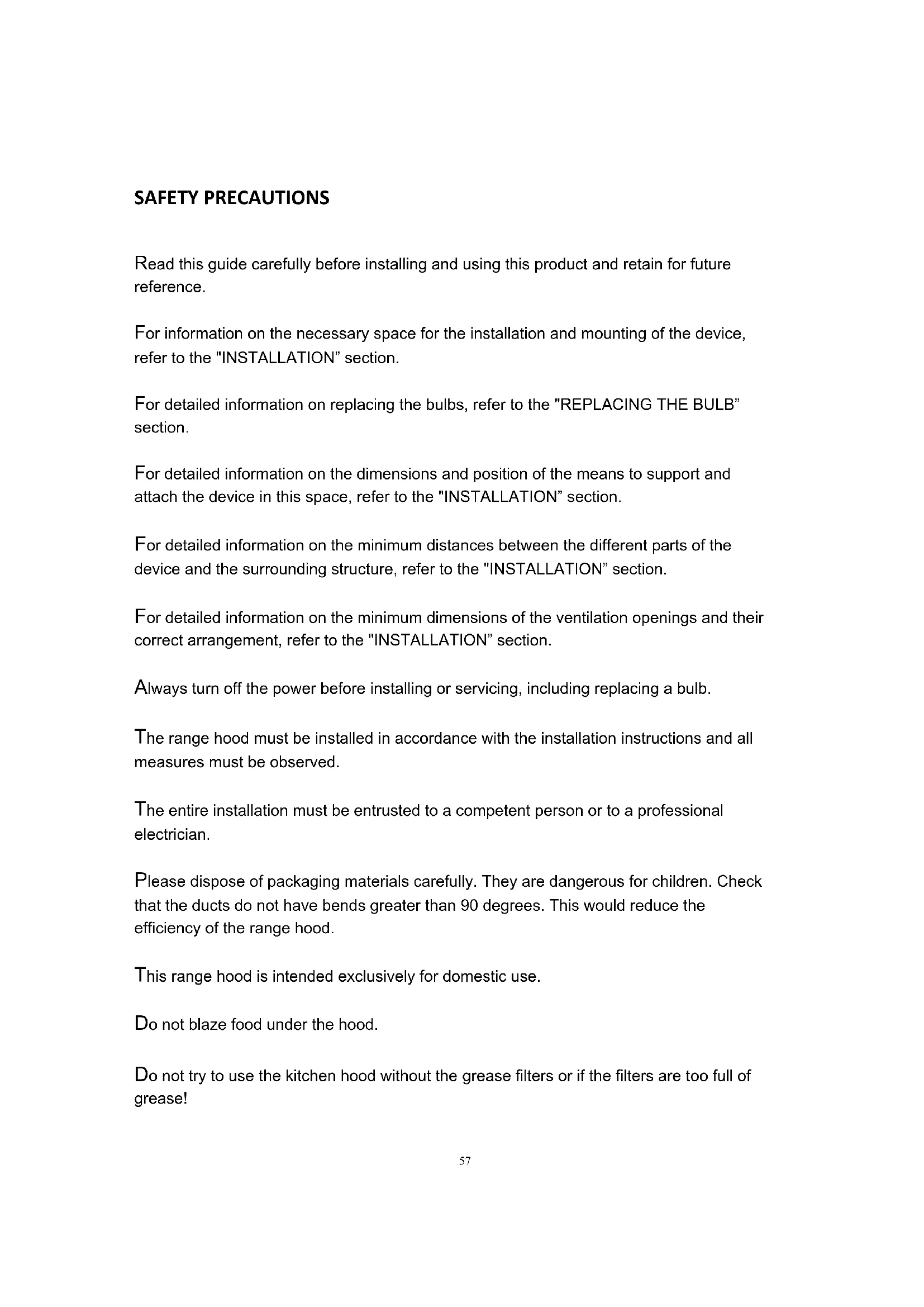 The entire installation must be entrusted to a competent person or to a professional electrician. Please dispose of packaging materials carefully. They are dangerous for children. Check that the ducts do not have bends greater than 90 degrees. This would reduce the efficiency of the range hood. This range hood is intended exclusively for domestic use.