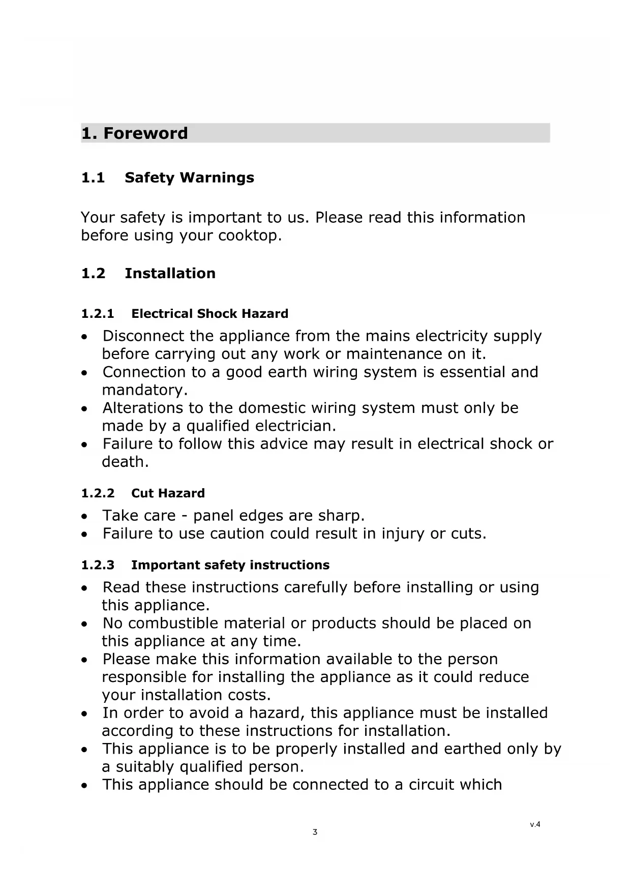 Read these instructions carefully before installing or using this appliance. No combustible material or products should be placed on this appliance at any time. Please make this information available to the person responsible for installing the appliance as it could reduce your installation costs. In order to avoid a hazard, this appliance must be installed according to these instructions for installation. This appliance is to be properly installed and earthed only by a suitably qualified person. This appliance should be connected to a circuit which v.4 3incorporates an isolating switch providing full disconnection from the power supply. Failure to install the appliance correctly could invalidate any warranty or liability claims.