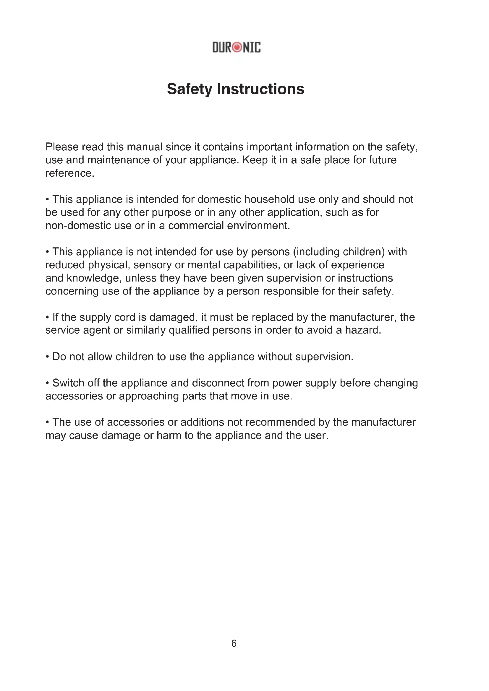 - This appliance is intended for domestic household use only and should not be used for any other purpose or in any other application, such as for non-domestic use or in a commercial environment.