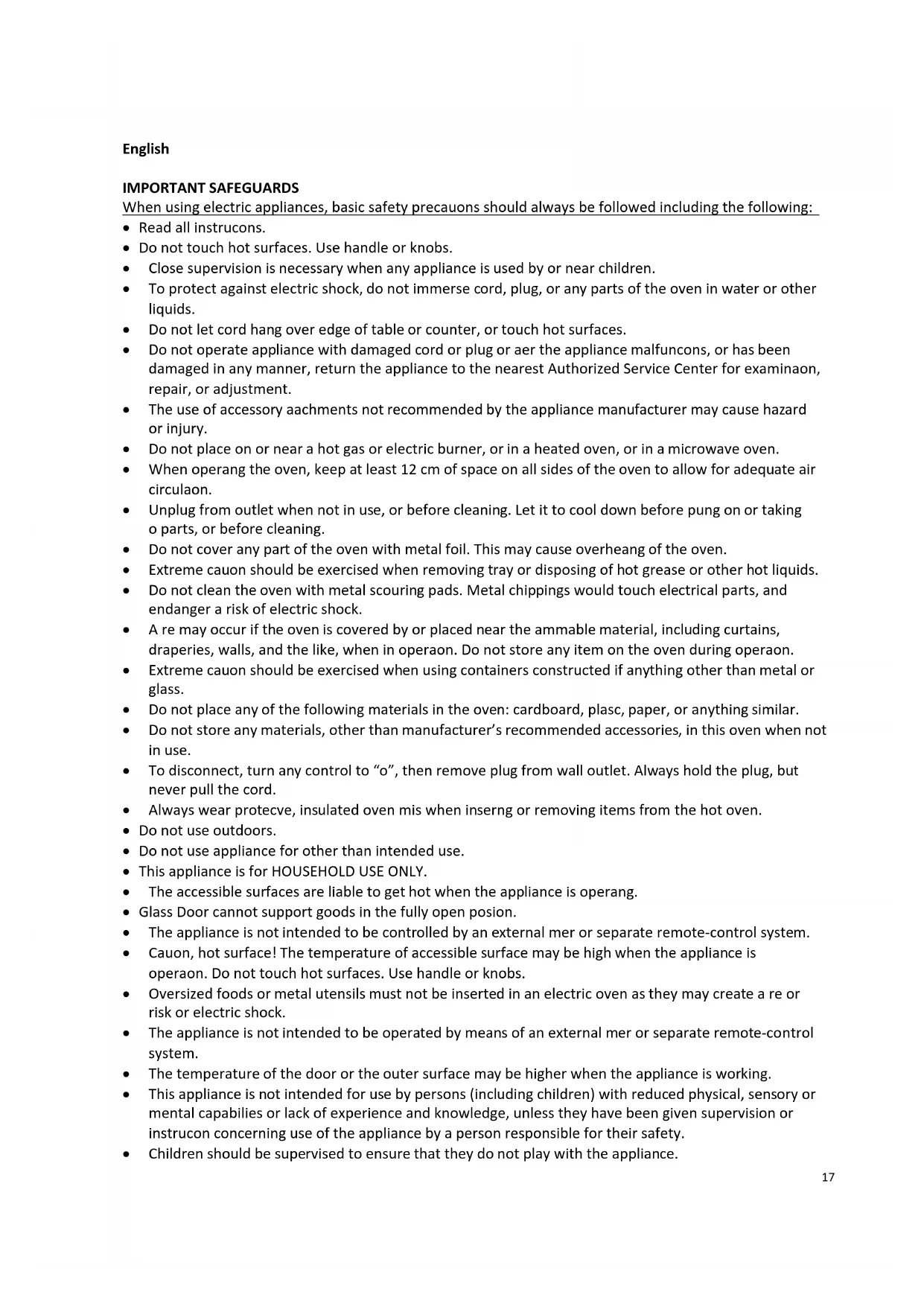 Before use: Read all instructions included in this manual. Make sure oven is unplugged and Timer Knob is in the “OFF” position. Remove all accessories and wash it in hot sudsy water or in dishwasher. Thoroughly dry all accessories and re-assemble in oven. Plug oven into outlet and you are ready to use your new cooker with Convection and Grill. It may result in smell or smoke for the first use. This is normal. It is due to the protective substance on heating elements, which avoids salt effects during shipping from factory. So it is recommended operating oven dry for about 15 minutes at the first, moreover, making sure to keep good ventilation of the room. When using the oven: Confirm the marked power consumption is in conformity with your household electric power. Do not let cord hang over edge of table or counter to avoid that children may stumble over. If the supply cord is damaged, the oven should not be used before it is repaired. Oven should be sent to the manufacturer, authorized service agent or a similarly qualified person to repair in order to avoid a hazard. This unit has a short power supply cord to reduce the risk resulting from becoming entangled in or tripping over a long cord. An extension cord may be used if you are careful in its use: The electric rating of the extension cord should be at least as great as the electrical rating of the appliance. An extension cord with the power cord must be arranged so that it will not drape over the countertop or table top where they can be pulled on by children or tripped over accidentally.19 Components oven