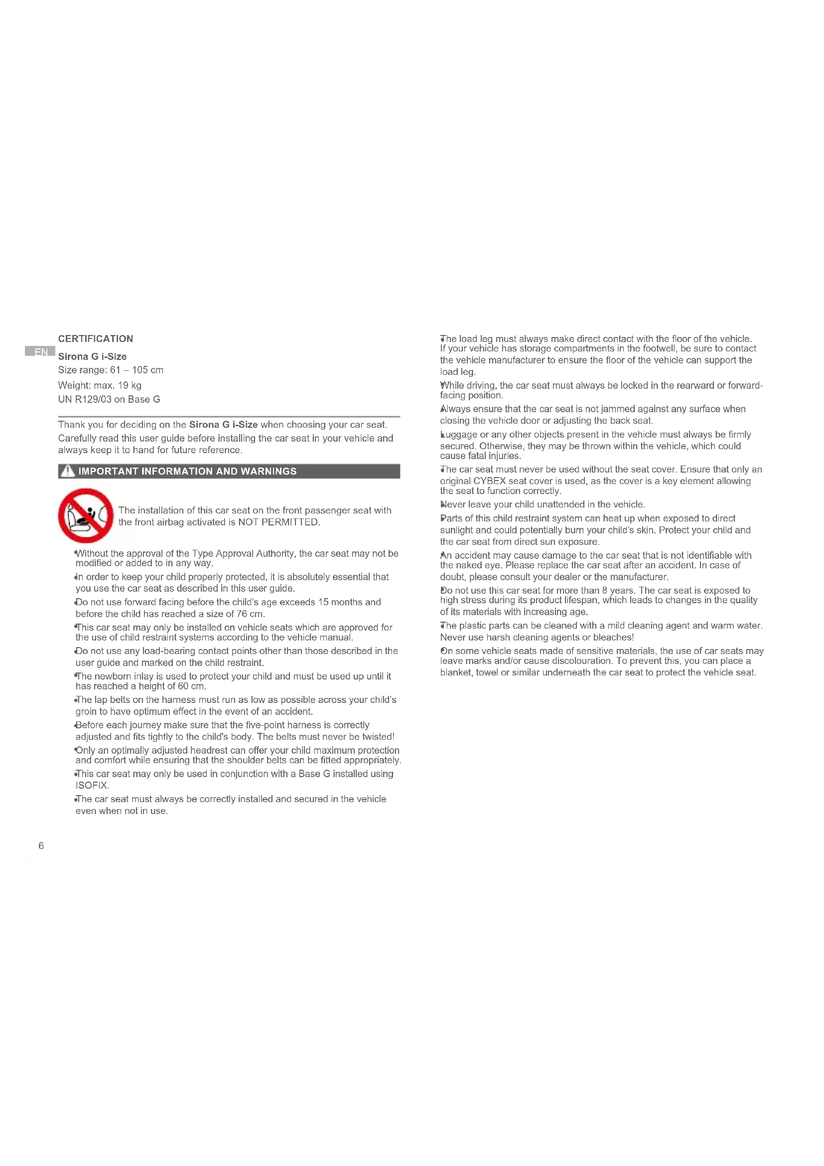 CERTIFICATION Sirona G i-Size Size range: 61 – 105 cm Weight: max. 19 kg UN R129/03 on Base G Thank you for deciding on the Sirona G i-Size when choosing your car seat. Carefully read this user guide before installing the car seat in your vehicle and always keep it to hand for future reference.
