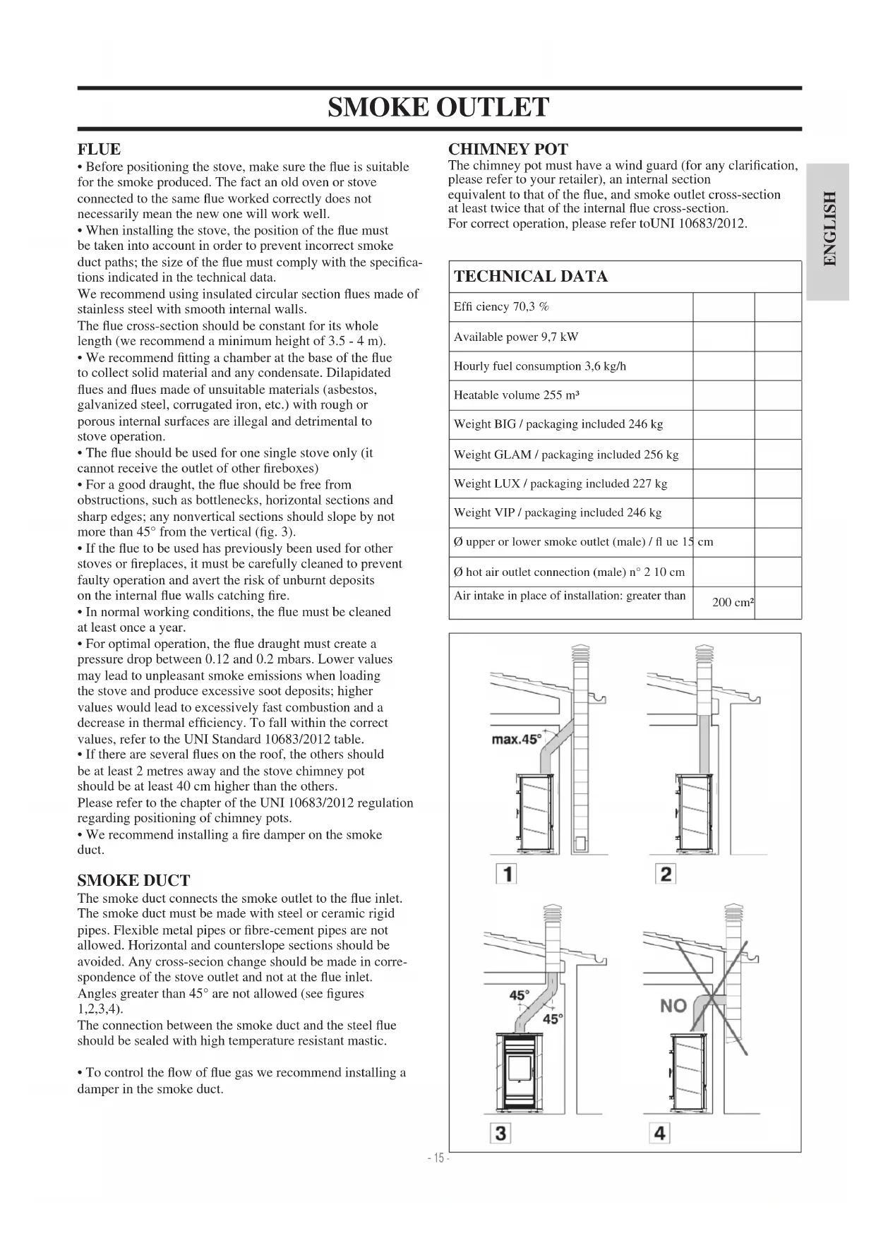 FRONT BACK SIDE SYSTEM Smoke outlet Ø 150 mm- 15 - ENGLISH TECHNICAL DATA Effi ciency 70,3 % Available power 9,7 kW Hourly fuel consumption 3,6 kg/h Heatable volume 255 m³ Weight BIG / packaging included 246 kg Weight GLAM / packaging included 256 kg Weight LUX / packaging included 227 kg Weight VIP / packaging included 246 kg Ø upper or lower smoke outlet (male) / fl ue 15 cm Ø hot air outlet connection (male) n° 2 10 cm Air intake in place of installation: greater than 200 cm² FLUE