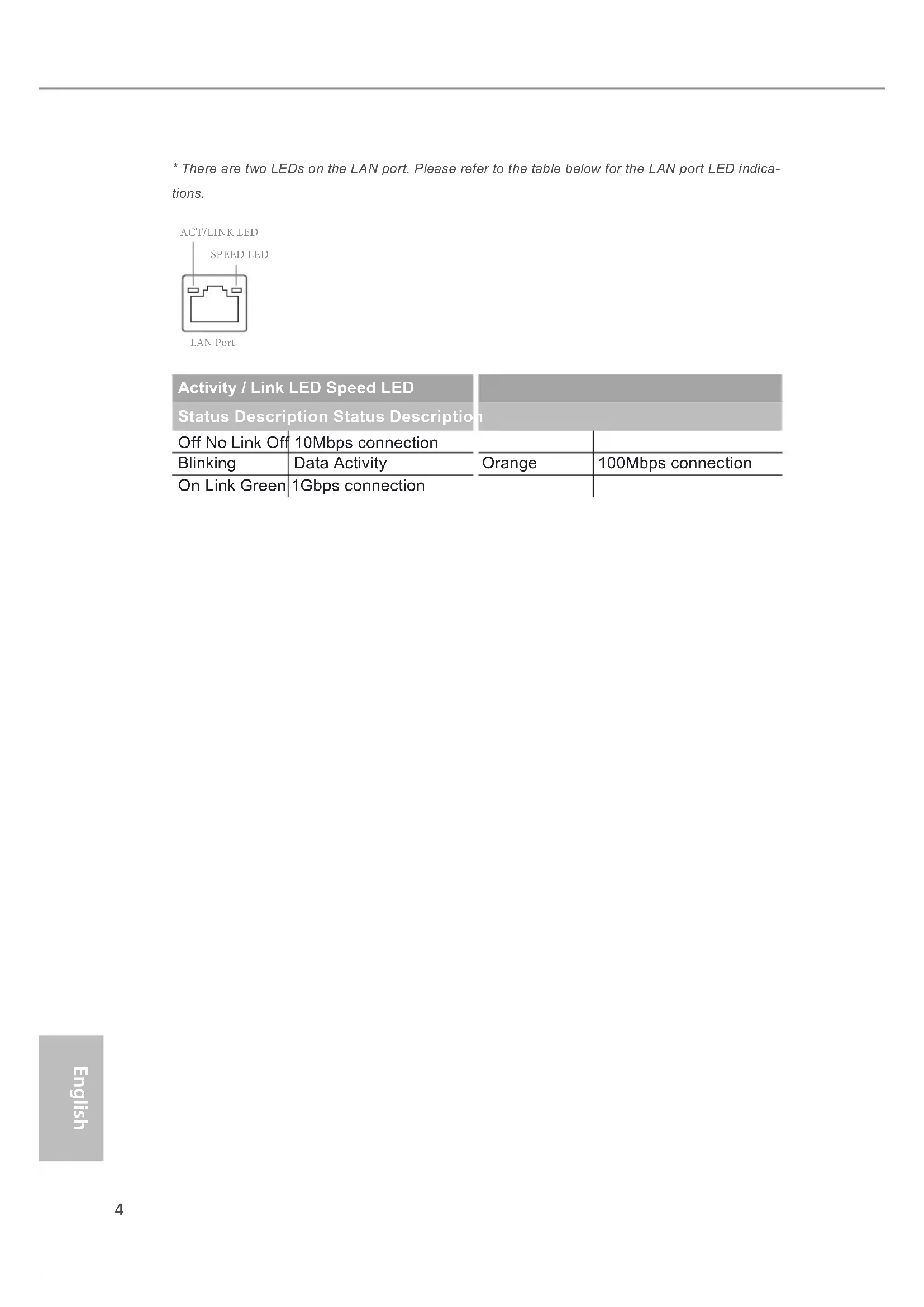 - There are two LEDs on the LAN port. Please refer to the table below for the LAN port LED indica- tions. Activity / Link LED Speed LED Status Description Status Description Off No Link Off 10Mbps connection Blinking Data Activity Orange 100Mbps connection On Link Green 1Gbps connection