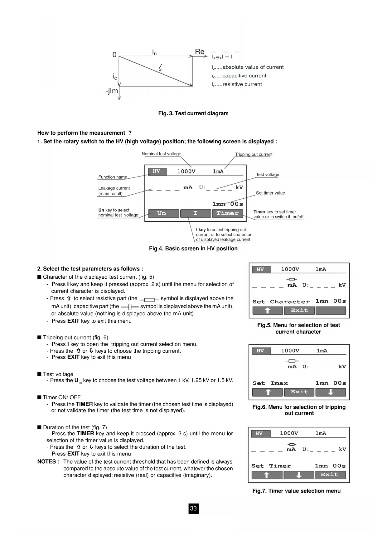 ñ to select resistive part (the symbol is displayed above the mA unit), capacitive part (the symbol is displayed above the mA unit), or absolute value (nothing is displayed above the mA unit). - Press EXIT key to exit this menu ■ Tripping out current (fig. 6) - Press I key to open the tripping out current selection menu. - Press the