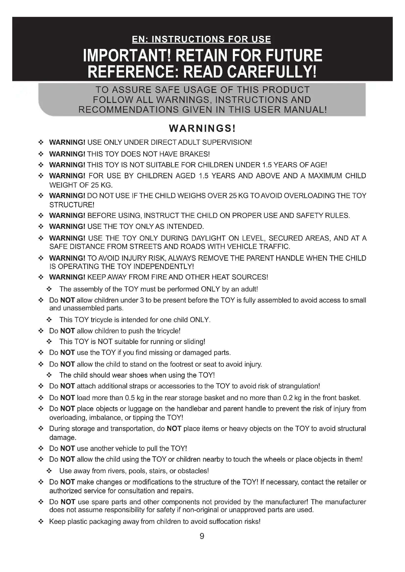 REFERENCE: READ CAREFULLY! WARNINGS! WARNING! USE ONLY UNDER DIRECT ADULT SUPERVISION! WARNING! THIS TOY DOES NOT HAVE BRAKES! WARNING! THIS TOY IS NOT SUITABLE FOR CHILDREN UNDER 1.5 YEARS OF AGE! WARNING! FOR USE BY CHILDREN AGED 1.5 YEARS AND ABOVE AND A MAXIMUM CHILD WEIGHT OF 25 KG. WARNING! DO NOT USE IF THE CHILD WEIGHS OVER 25 KG TO AVOID OVERLOADING THE TOY STRUCTURE! WARNING! BEFORE USING, INSTRUCT THE CHILD ON PROPER USE AND SAFETY RULES. WARNING! USE THE TOY ONLY AS INTENDED. WARNING! USE THE TOY ONLY DURING DAYLIGHT ON LEVEL, SECURED AREAS, AND AT A SAFE DISTANCE FROM STREETS AND ROADS WITH VEHICLE TRAFFIC. WARNING! TO AVOID INJURY RISK, ALWAYS REMOVE THE PARENT HANDLE WHEN THE CHILD IS OPERATING THE TOY INDEPENDENTLY! WARNING! KEEP AWAY FROM FIRE AND OTHER HEAT SOURCES! The assembly of the TOY must be performed ONLY by an adult! Do NOT allow children under 3 to be present before the TOY is fully assembled to avoid access to small and unassembled parts. This TOY tricycle is intended for one child ONLY. Do NOT allow children to push the tricycle! This TOY is NOT suitable for running or sliding! Do NOT use the TOY if you nd missing or damaged parts. Do NOT allow the child to stand on the footrest or seat to avoid injury. The child should wear shoes when using the TOY! Do NOT attach additional straps or accessories to the TOY to avoid risk of strangulation! Do NOT load more than 0.5 kg in the rear storage basket and no more than 0.2 kg in the front basket. Do NOT place objects or luggage on the handlebar and parent handle to prevent the risk of injury from overloading, imbalance, or tipping the TOY! During storage and transportation, do NOT place items or heavy objects on the TOY to avoid structural damage. Do NOT use another vehicle to pull the TOY! Do NOT allow the child using the TOY or children nearby to touch the wheels or place objects in them! Use away from rivers, pools, stairs, or obstacles! Do NOT make changes or modications to the structure of the TOY! If necessary, contact the retailer or authorized service for consultation and repairs. Do NOT use spare parts and other components not provided by the manufacturer! The manufacturer does not assume responsibility for safety if non-original or unapproved parts are used. Keep plastic packaging away from children to avoid suocation risks!
