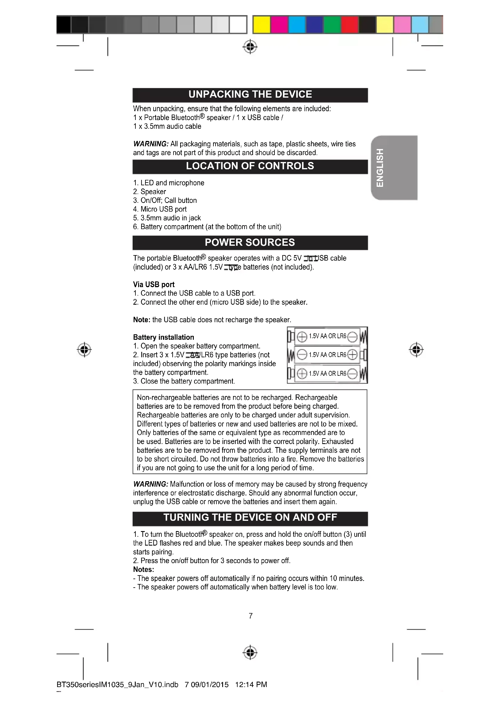 speaker operates with a DC 5V in USB cable (included) or 3 x AA/LR6 1.5V type batteries (not included). Via USB port