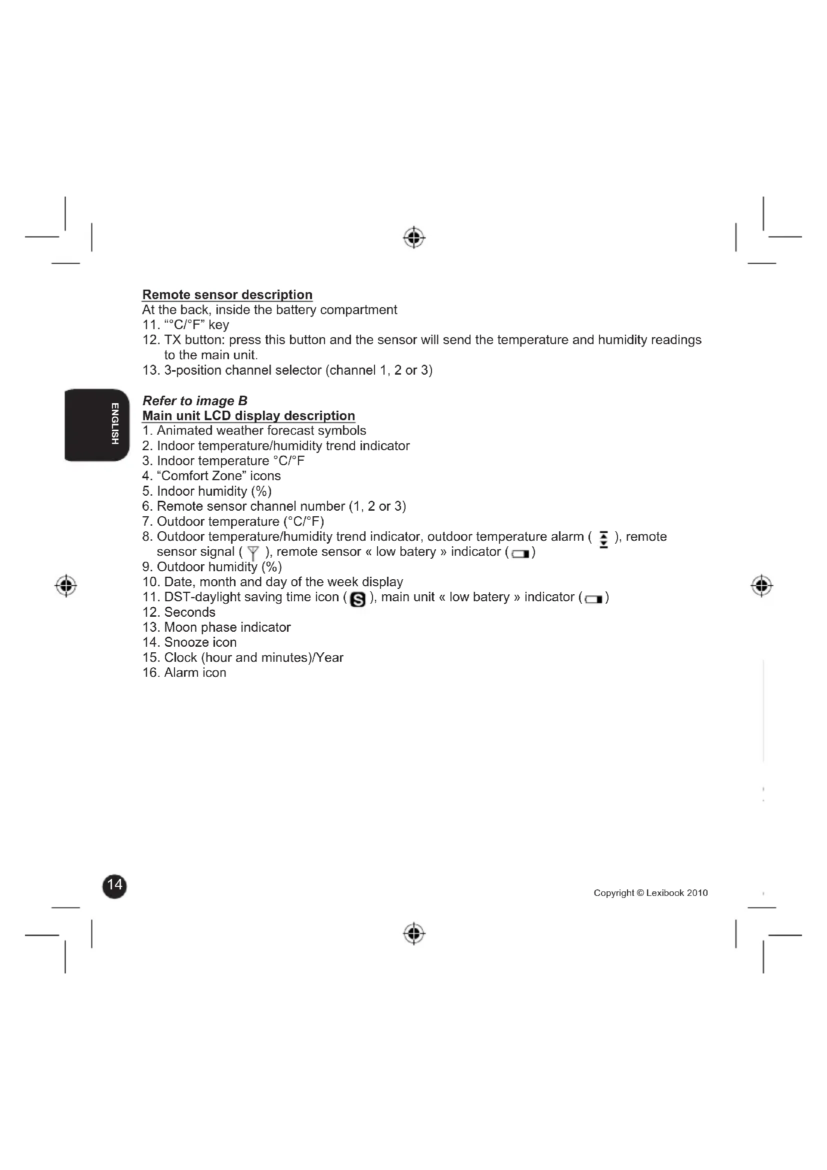 Copyright © Lexibook 2010 Copyright © Lexibook 2010 Remote sensor description At the back, inside the battery compartment