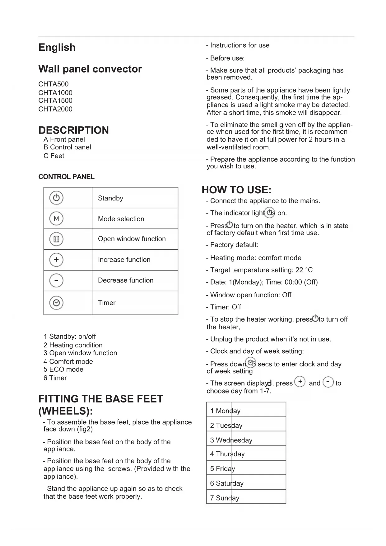 APPLIANCE: - Turn the appliance off using the on/off button. - Unplug the appliance from the mains. - Clean the appliance. - Safety thermal protector:- The appliance has a safety device, which pro- tects the appliance from overheating. - When the appliance switches itself on and off repeatedly, for reasons other than the thermostat control, check to ensure that there are no obstacles that impede correct air entry or expulsion. - If the appliance turns itself off and does not switch itself on again, disconnect it from the mains supply, and wait for approximately 15 minutes before reconnecting. If the machine does not start again seek authorised technical assistance. CLEANING - Disconnect the appliance from the mains and allow it to cool before undertaking any cleaning task. - Clean the equipment with a damp cloth with a few drops of washing-up liquid and then dry. - Do not use solvents, or products with an acid or base pH such as bleach, or abrasive products, for cleaning the appliance. - Do not let water or any other liquid get into the air vents to avoid damage to the inner parts of the appliance. - Never submerge the appliance in water or any other liquid or place it under running water. - If the appliance is not in good condition of cleanliness, its surface may degrade and inexorably affect the duration of the appliance’s useful life and could become unsafe to use. - Remark: When the appliance is used as a hea- ter after long periods in storage or after having been used solely as a fan a small amount of smoke may be produced. This is not important and is due to the heater burning dust de- posits which have accumulated on the heating element. This phenomenon may be avoided by cleaning the inside of the appliance before- hand through the grill with a vacuum cleaner or pressurised air.Français Convecteur mural CHTA500 CHTA1000 CHTA1500 CHTA2000 DESCRIPTION A Panneau frontal B Panneau de commande C Pieds